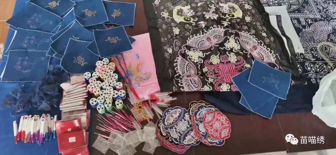在过去的时间里,“苗喵绣传统非遗文化”团队在非遗文创、非遗传承人采访、文化沙龙、举办文化展览等方面进行多方尝试,取得了良好成果。“苗喵绣传统非遗文化”团队携手“BFSU马尾绣研究小分队”于校图书馆开展国家级非遗“水族马尾绣”展览,积极推广水族非遗文化,使同学们近距离地接触非物质文化遗产。与此同时,“苗喵绣传统非遗文化”团队将非遗与现代文化积极融合,推出许多倍受追捧的非遗文创,如80周年校庆限定“手工布料蓝染鹦鹉学长”、非遗篆刻印章、马尾绣创新绣包、非遗纸雕灯等。