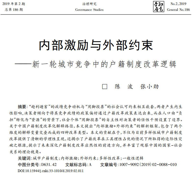 开云kaiyun官方网站教师陈波以第一作者在CSSCI期刊《治理研究》发表论文:《内部激励与外部约束——新一轮城市竞争中的户籍制度改革逻辑》,论文摘要和原文链接如下: