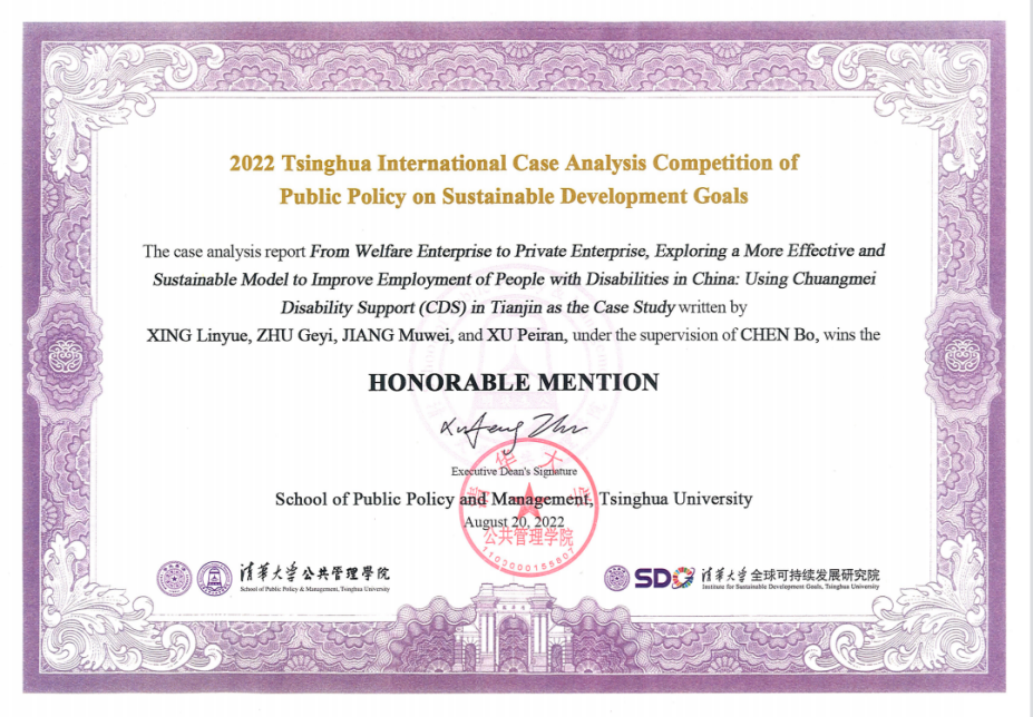 开云官网学生聚焦“从福利企业到私营企业,探索更加有效和可持续的模式促进残疾人就业:以创美模式为例”(From welfare enterprise to private enterprise, exploring a more effective and sustainable model to improve employment of people with disabilities in China: using Chuangmei Disability Support (CDS) in Tianjin as the case study),通过探访天津创美助残基地,了解我国目前最新的推动残疾人就业模式,在陈波老师的指导下,从残疾人就业现状、就业政策变迁调整、企业助残困境、创美助残模式等角度进行案例研究,并提供建议。