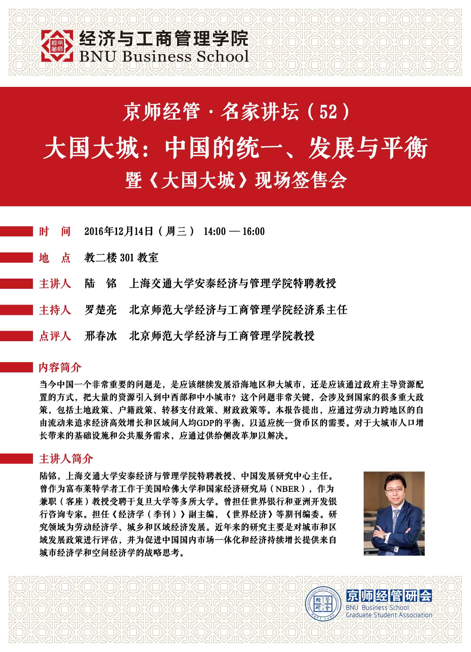 京师经管名家讲坛52期——大国大城:中国的统一、发展与平衡暨《大国大城》现场签售会