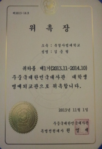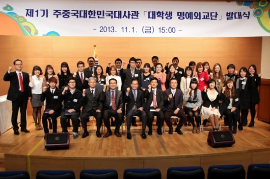2013年11月, 留学生金俊炯被韩国使馆任命第一届“大学生名义外交官”; 在北京的各大学和多所中学开展多次文化交流活动。