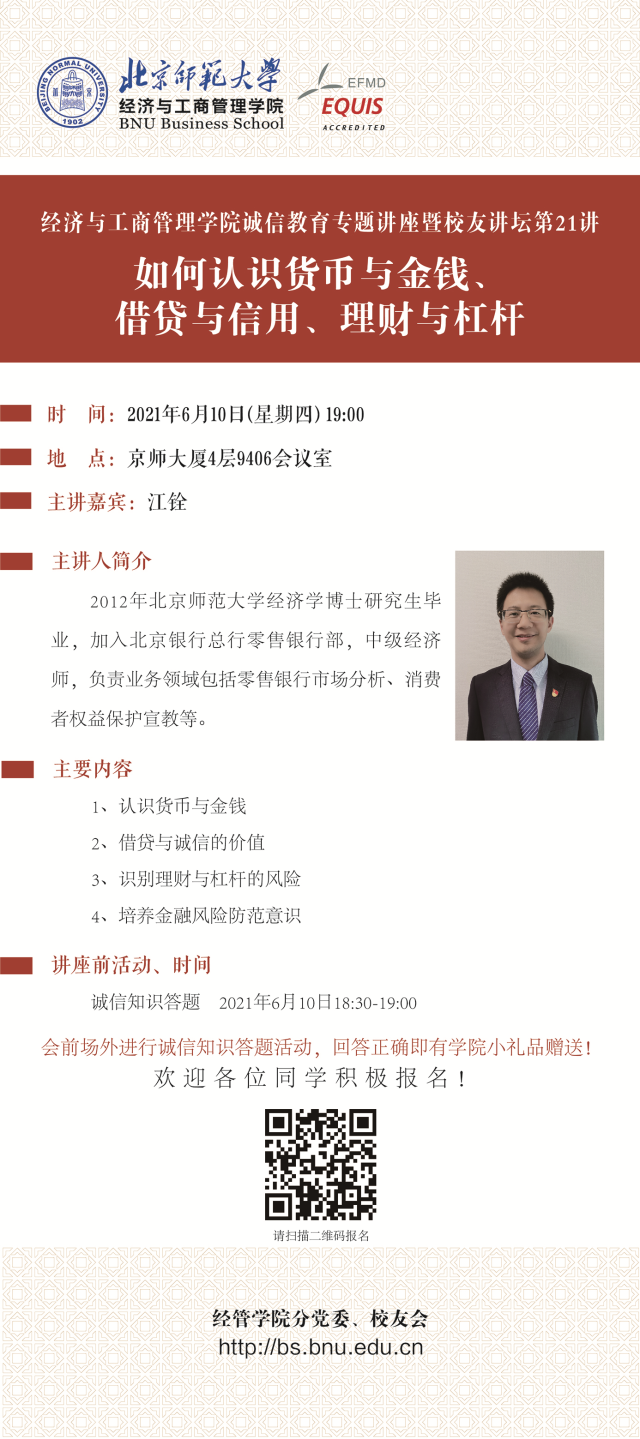 活动预告|诚信教育专题讲座暨校友讲坛第21讲:如何认识货币与金钱、借贷与信用、理财与杠杆
