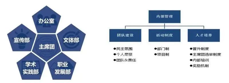经管学院研究生会主席团作为核心领导团队,统筹主线工作,下设办公室、宣传部、文体部、学术实践部和职业发展部五个职能部门。各部门职责明确,严格依照工作制度开展考评与活动,确保工作有序推进。