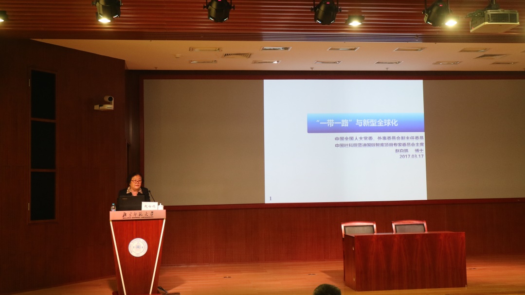 2017年3月17日下午,由bat365中文官方网站研究生会主办的第53期京师经管名家讲坛成功举行。本次讲座邀请到全国人大常委会委员、外事委员会副主任委员、中国社科院蓝迪国际智库项目专家委员会主席赵白鸽带来主题为“一带一路与新型全球化”的演讲,讲座由bat365中文官方网站院长赖德胜主持。