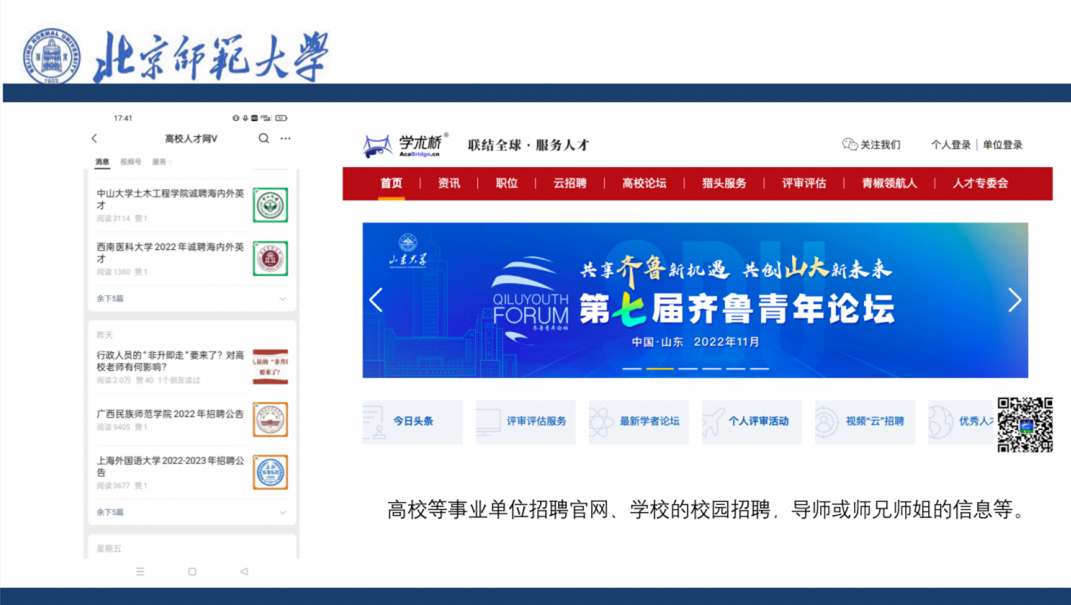 赵心慧师姐首先分享了各类高校和科研单位的官方招聘渠道,如人力资源保障部、各省份人力资源和社会保障局、教育部人才服务网、各大高校人事招聘网站等,同学们可以根据自己的意向单位有针对性地搜集招聘信息。
