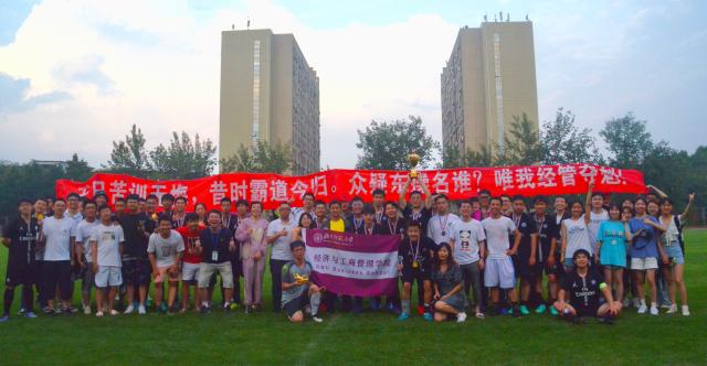 对方加强防守,试图将进球胜势保持到终场。可谁能料到,经管的表演才正式开始!丢球了,那还有何可畏惧?恰在此时,滂沱大雨雨戛然而止,晴天是留给经管的,虽无艳阳,但经管男足依然似狼!我方打出强力压制,一点点吞没对方后防线。那时,场下的球迷放飞自我,经管的鼓声,加油声,呐喊声响彻云霄,回声嘹亮!百位观众与球员同在,东操仿佛是我们的主场。那一刻,这场决赛,不仅仅是球队的决赛,更是经管的决赛。那一刻劣势,烟消云散。这,就是经管的凝聚力!这就是经管人!