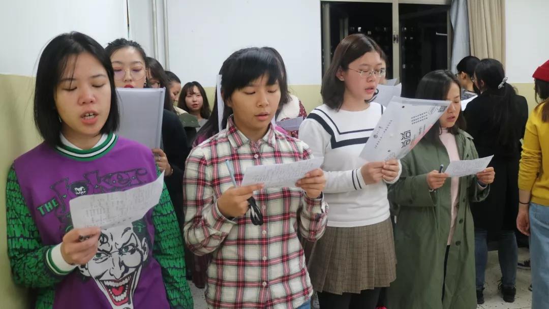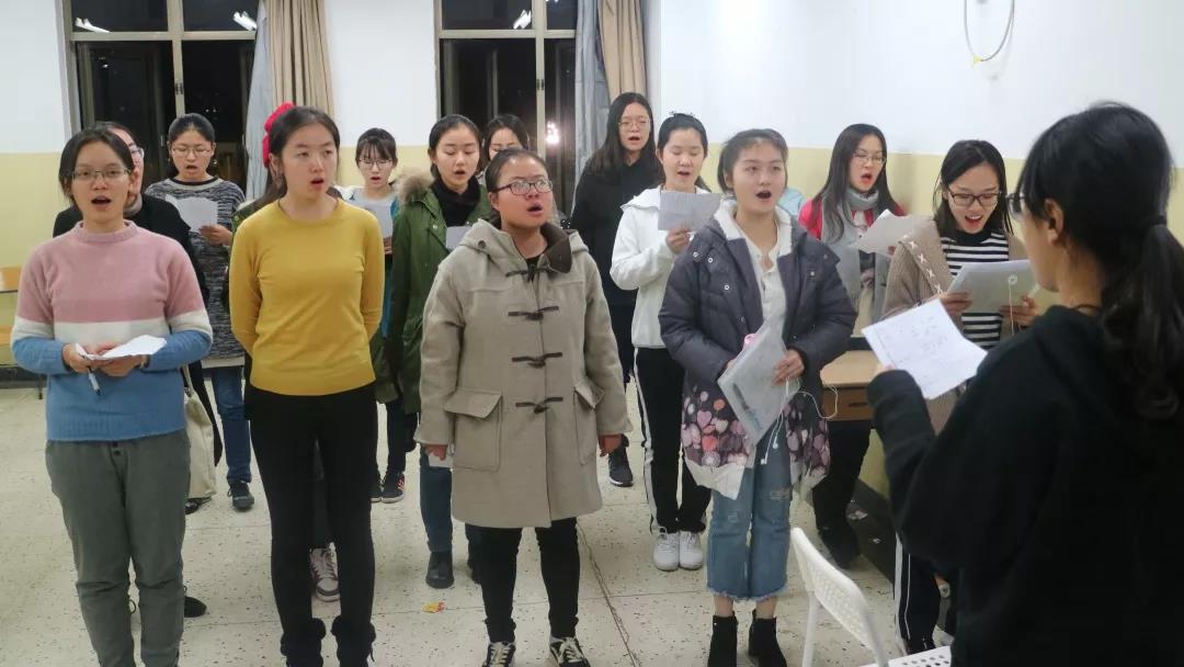 当然,排练并不都是辛苦的。作为迟到的惩罚,更有同学为大家带来精彩节目——阿楚姑娘。优美的歌声使同学们纷纷放开拘谨,排练室顿时充满了欢乐温馨的气氛。