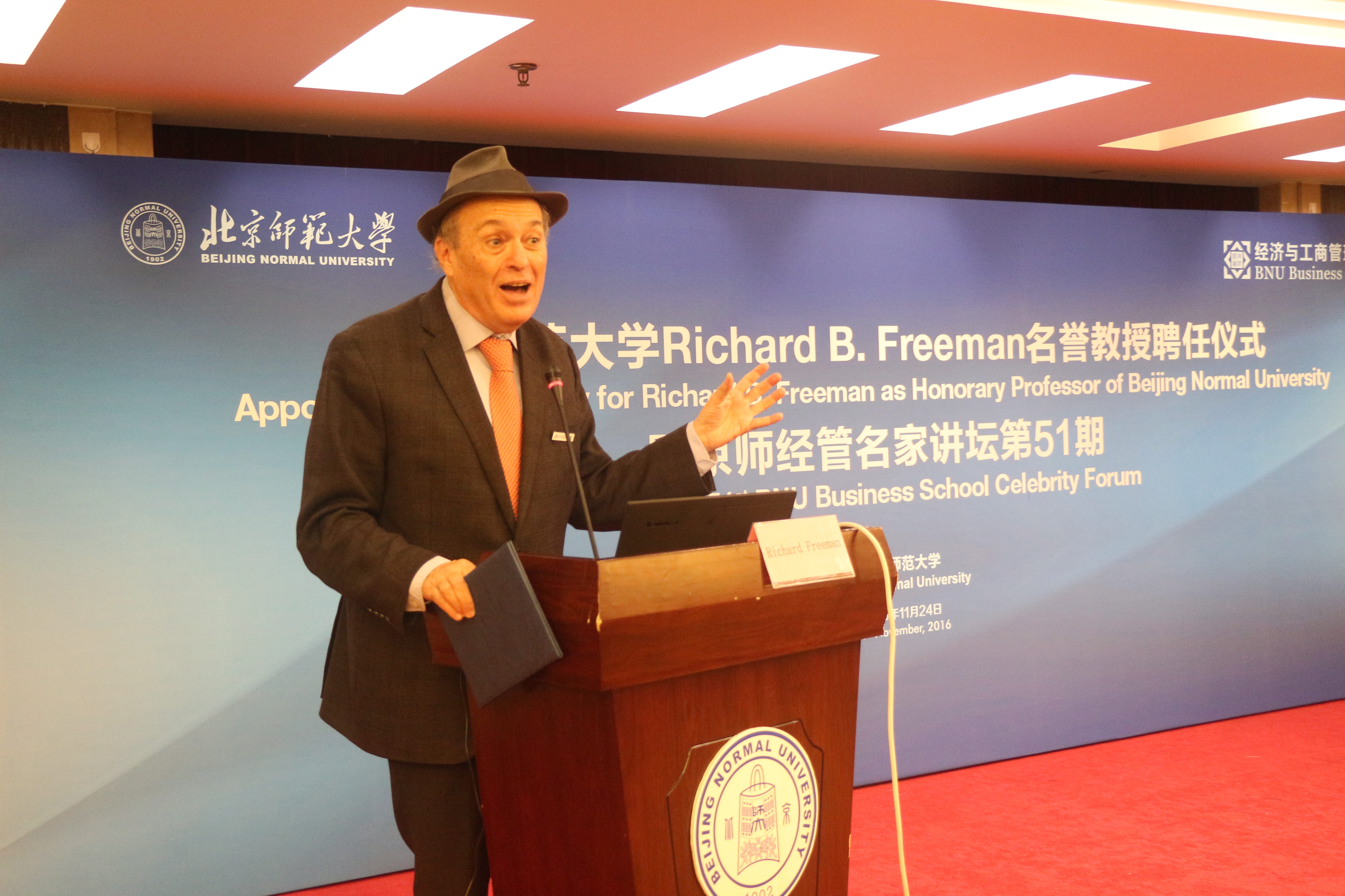 2016年11月24日下午,bat365中文官方网站Richard B. Freeman名誉教授聘任仪式暨第51期京师经管名家讲坛成功举行。哈佛大学教授、美国人文与科学院院士Richard B. Freeman,中国社会科学院人口与劳动经济研究所所长张车伟,北京大学经济学院教授王大树,bat365中文官方网站新兴市场研究院院长胡必亮,国际教育合作中心主任刘冷馨,bat365中文官方网站分党委书记孙志军、副院长张平淡,以及邢春冰教授、蔡宏波副教授等参加了活动。仪式由bat365中文官方网站院长赖德胜主持。