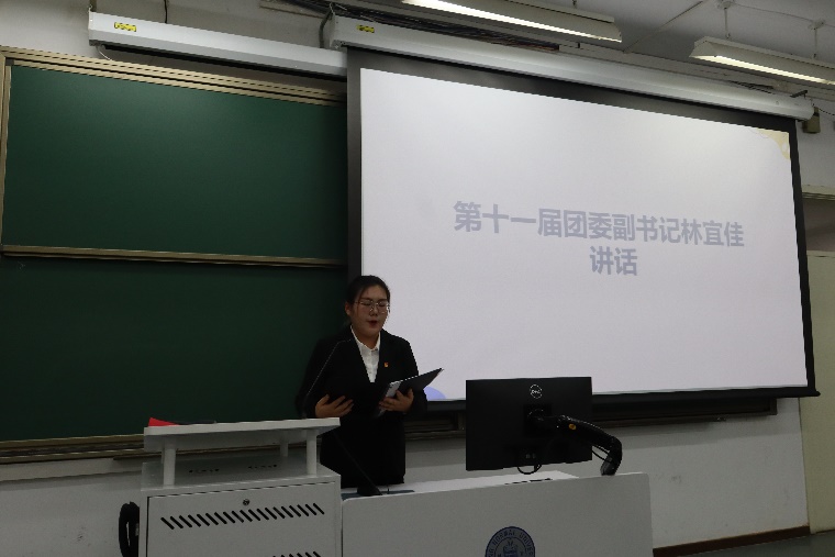 林宜佳同学首先回顾了团委在过去一年中的工作与成就,并感谢了老师们的大力支持、各位部长的细心引导和每位同学的辛勤付出。她表示,团委的过去离不开每一位成员的奇思妙想与辛勤耕耘,团委的未来更需要在座所有成员携手并进,共同书写。她希望全体团委团结有爱,互帮互助,在潜移默化中传递优秀品质,在生活学习中凝心聚力,在学生工作中奉献青春力量,共同铸就新一届团委更加辉煌的未来。