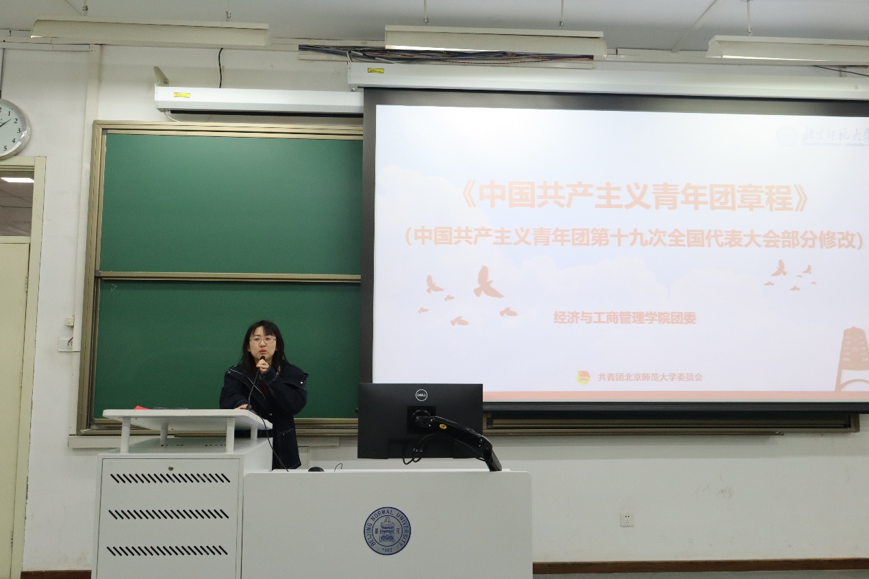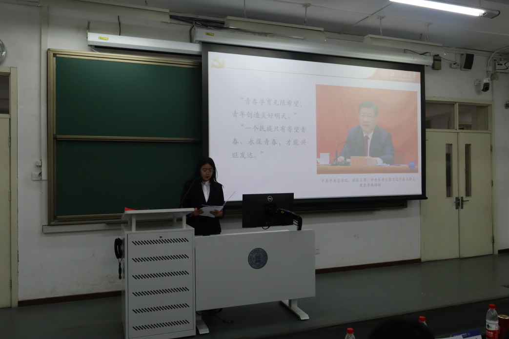 张卜心同学带领大家学习了习近平在庆祝中国共产主义青年团成立100周年大会上发表的重要讲话。分三个章节对习近平关于共青团和青年工作的讲话精神进行解读,并由此提出对全体团员的期望,号召我们全体经管学子要以习近平新时代中国特色社会主义思想为指引,坚定理想、主动担当、增长才干,以自强不息的精神、朝气蓬勃的姿态,奋力谱写中华民族伟大复兴进程中激昂的青春乐章。