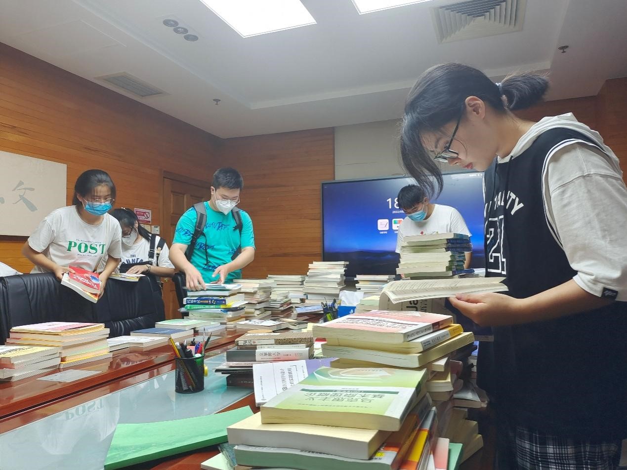 在活动开始前的准备工作中,学术竞赛部的成员们早早到达后主楼,把搜集到的书籍运送到现场,并且将书籍进行分类整理,有序地摆放在桌子上,以方便同学们挑选。经济学类、数学类、英语类、考研考公类、课外读物类……毕业季收书活动中,师兄师姐们捐赠的图书可谓应有尽有,为大一刚入校的新生们提供了巨大的便利。