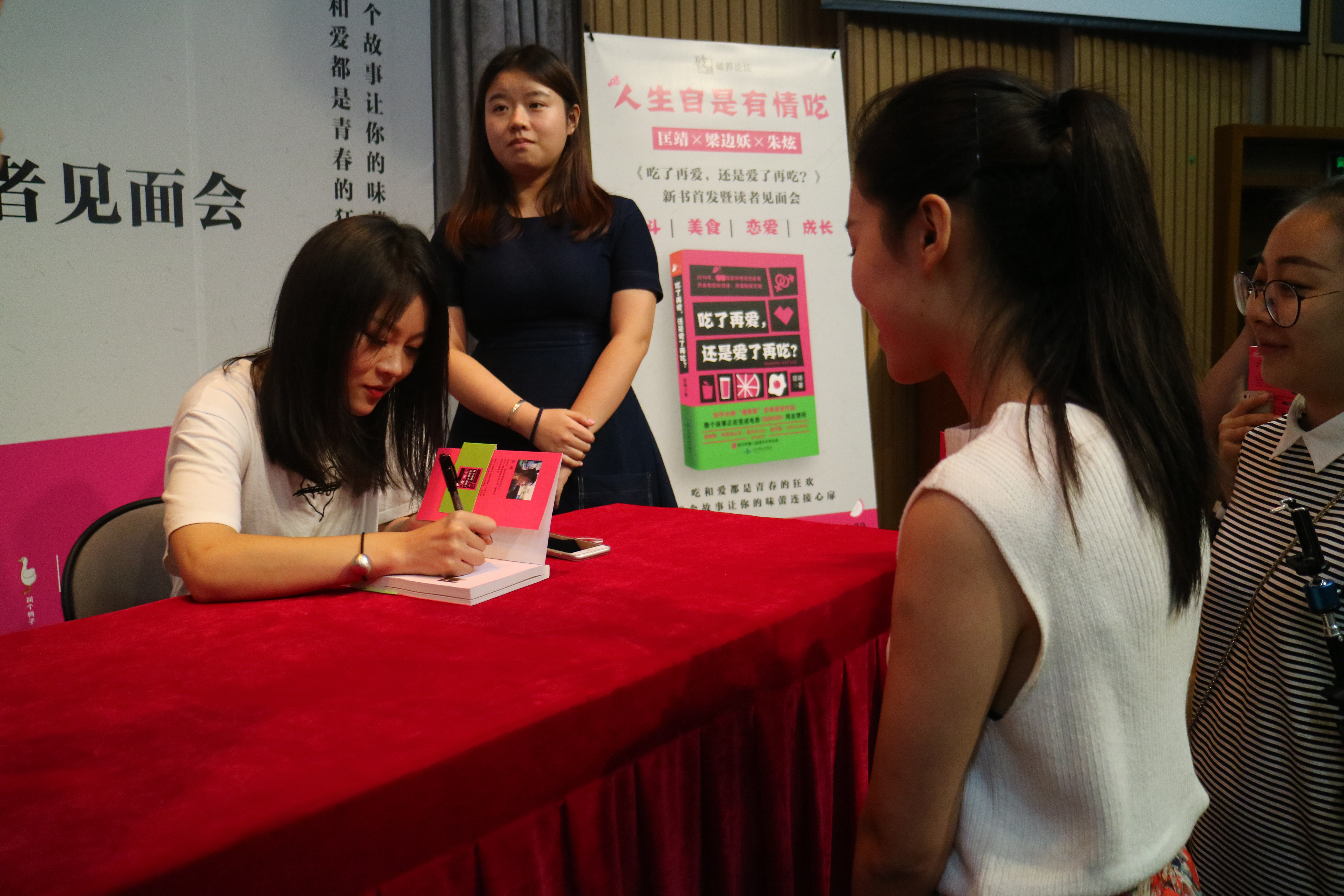 当提问环节开始,发问权从主持人到了观众,现场气氛更是激昂上涨,热门话题如恋爱,三位嘉宾们纷纷“语出惊人”,却又不乏生活智慧,诸如:“动小情不伤身”“大爱应该是给人间的,你不要把大爱给每一个人”;轻松话题如采访边妖“如何保养的一头秀发”,边妖在感叹不文艺的同时也提出了“不烫不染”的建议;作为受欢迎指数最高的朱炫则分享了“作家应随时记下灵感”等干货。