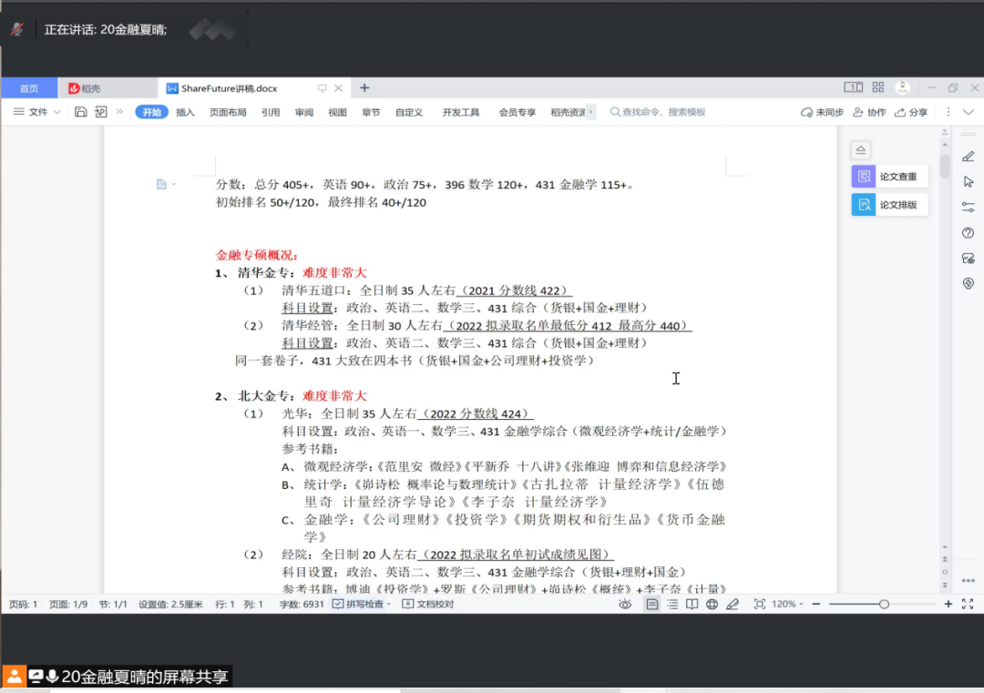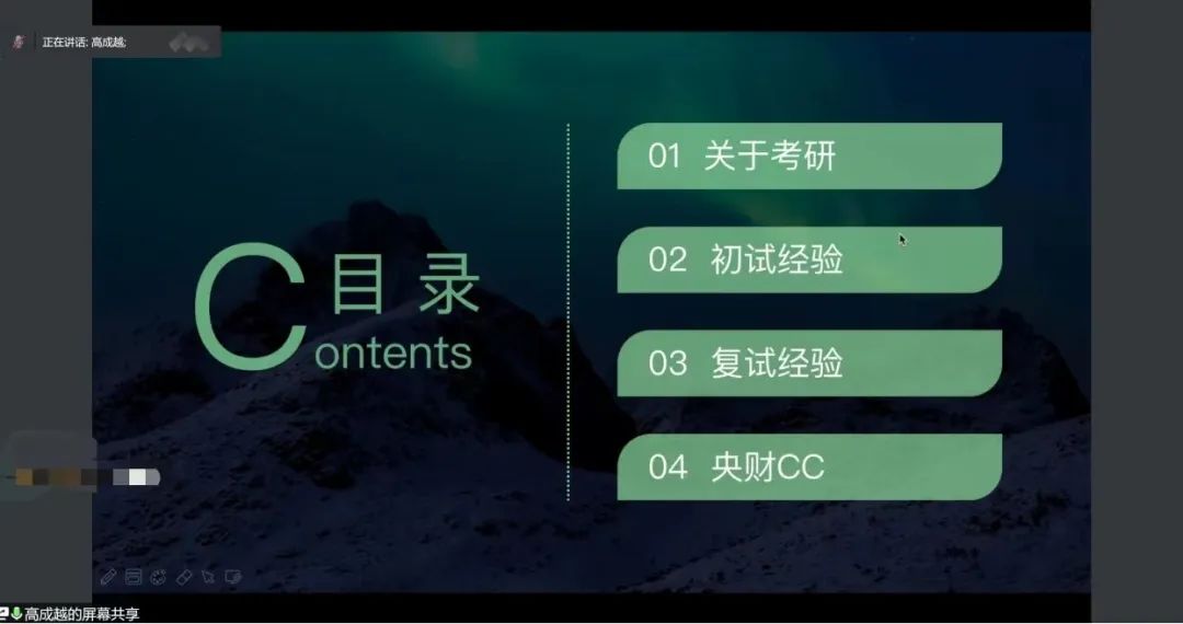 首先向大家分享的是18级经济专业的杨承益,她成功上岸了中国人民大学金融学专业硕士。她重点讲解了北京地区高校金融专硕的考试总体情况,分享了清华大学、北京大学、中国人民大学、中央财经大学、对外经济贸易大学金融专硕的考试形式和考试科目。杨承益指出,虽然人大专硕性价比较高,但不能忽略其报考人数非常多且很难调剂。她认为考研过程中效率是最重要的,要找对背诵的方法,并保持良好的心态。最后,她祝福大家都能如愿以偿。