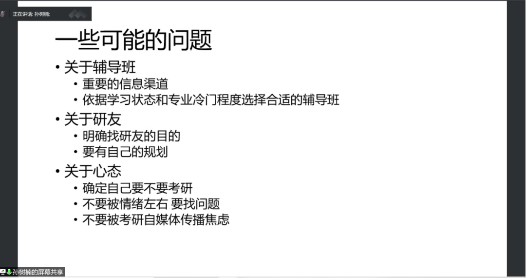 最后一位向大家分享的是18级会计专业的孙树楠,他成功上岸了中国人民大学国际商务专业硕士。他为大家介绍了国际商务专硕的考试内容,列出了自己的时间安排表供大家参考,给出了每个科目相应的备考建议。最后,他就辅导班、研友、备考心态等问题与大家进行真诚的交流。
