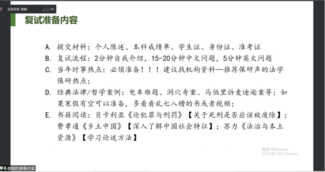 第四位向大家分享的是18级会计专业的李丹,她成功上岸了清华大学非法本法学硕士。她向大家介绍了非法本法硕,分享了择校、初试准备、复试准备的相关经验。她总结道,选择非法本法硕有利有弊:优点是初试不考数学、全国统考、招生人数多和可以更换赛道;缺点是考试门槛低、考试人数多、认可度不如法本、毕业后才可进行法考。此外,她为大家介绍了清华大学非法本法硕的基本情况与初试的复习方案。由于清华大学非法本法硕复试分数占比高达50%,她也详细地为大家介绍了如何准备复试,强调必须准备当年的时事热点。