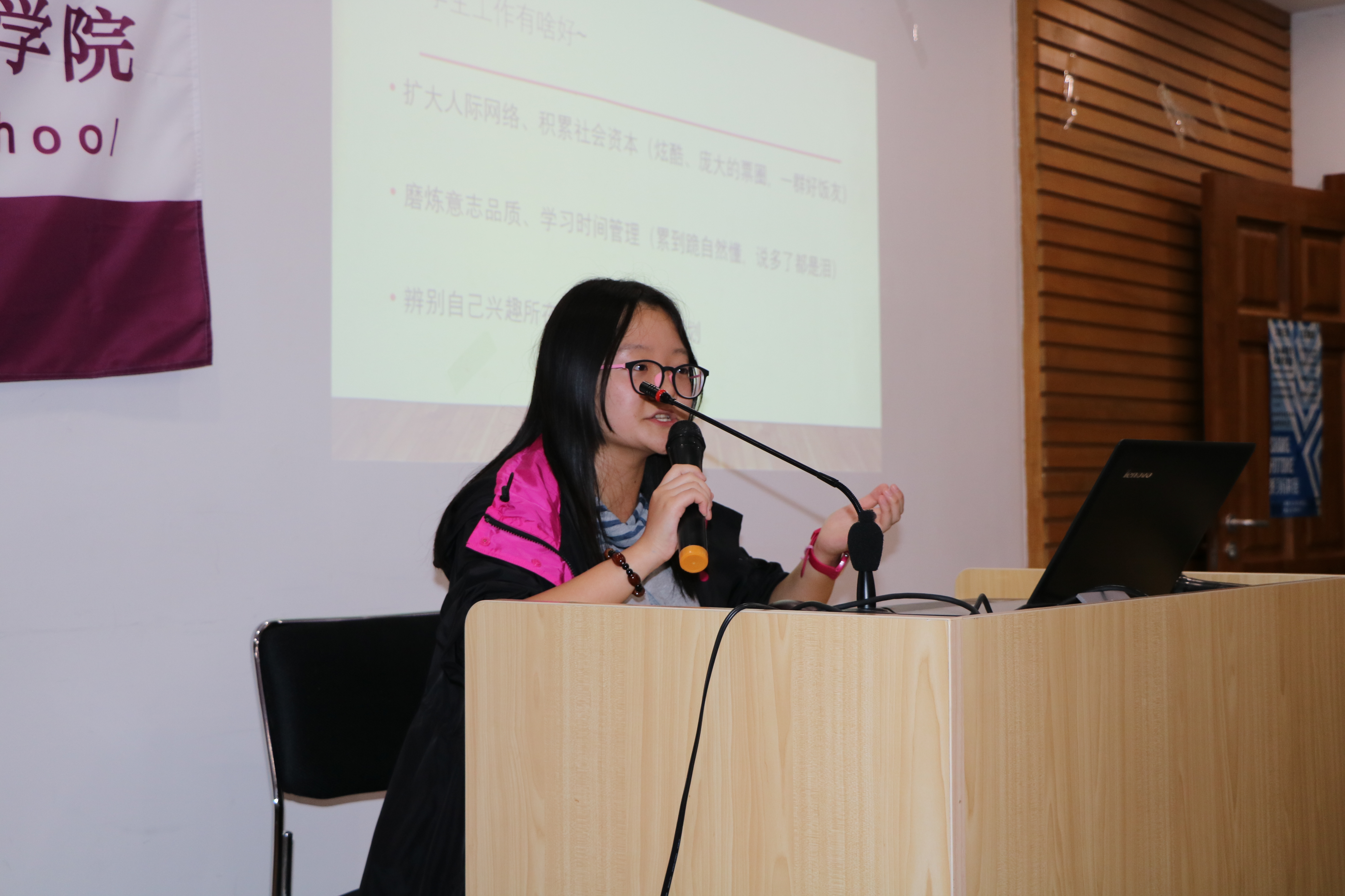 首先为大家分享经验的是14级工管系刘子谞。她主要通过结合自身经历,介绍如何平衡学习与学生工作。她认为,学生工作在扩大人际网络,锻炼意志品质,学习时间管理和做好未来规划方面有着不可估摸的作用。但随着学习压力的日益加重,我们也应该根据自身兴趣和人生方向进行理性取舍。她最后通过引用论语里的“取乎其上,得乎其中;取乎其中,得乎其下;取乎其下,则无所得矣。”激励我们要学会规划,随时为自己设定“小目标”。