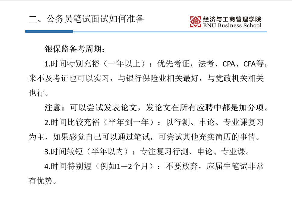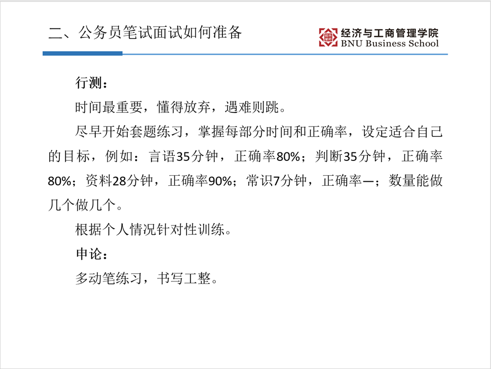 在公务员笔试方面,根据行测的考试特点,杨景云师姐建议把时间分配放在第一位,懂得取舍,遇到难题就跳过;尽早开始套题练习,掌握每部分时间和正确率,设定适合自己的目标;后期要根据个人情况做针对性训练;对于申论,她建议我们做到多动笔练习,书写工整。
