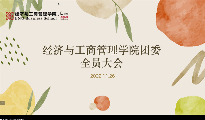 2022年11月26日上午9:30,bat365中文官方网站团委全员大会以线上形式圆满召开。本次大会由学院团委办公室干事乔治和经心服务部干事鲜伶颖共同主持。参加本次大会的有bat365中文官方网站党委副书记韩丽丽老师,团委书记常欣扬老师,第九届团委副书记宋继龙,第十届团委副书记刘婉茹、张潘岩、孙玮祎和第十届团委部长团以及各部门干事。