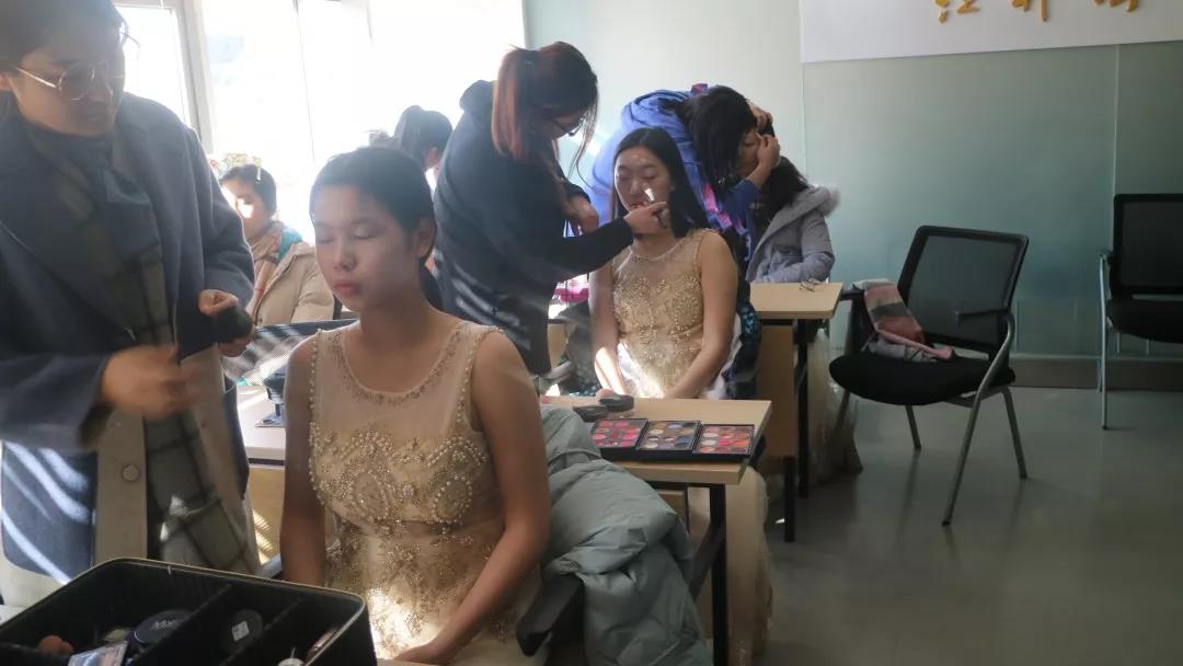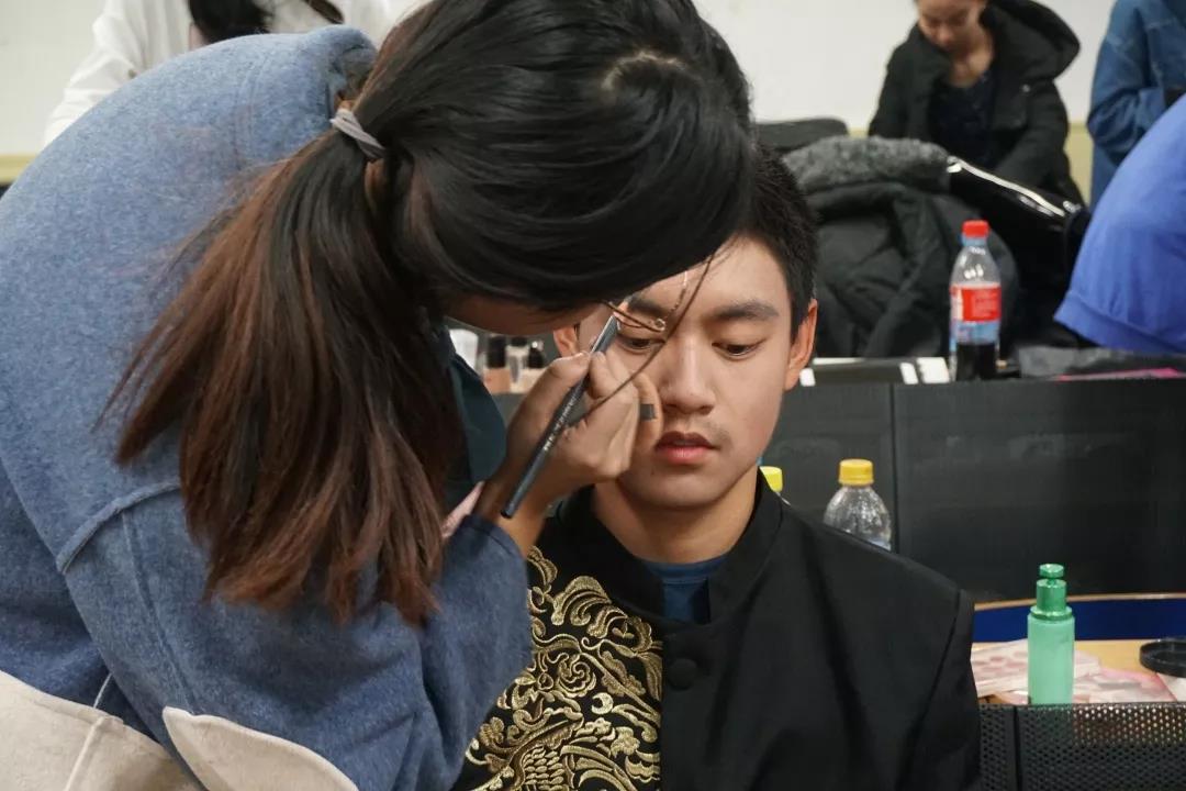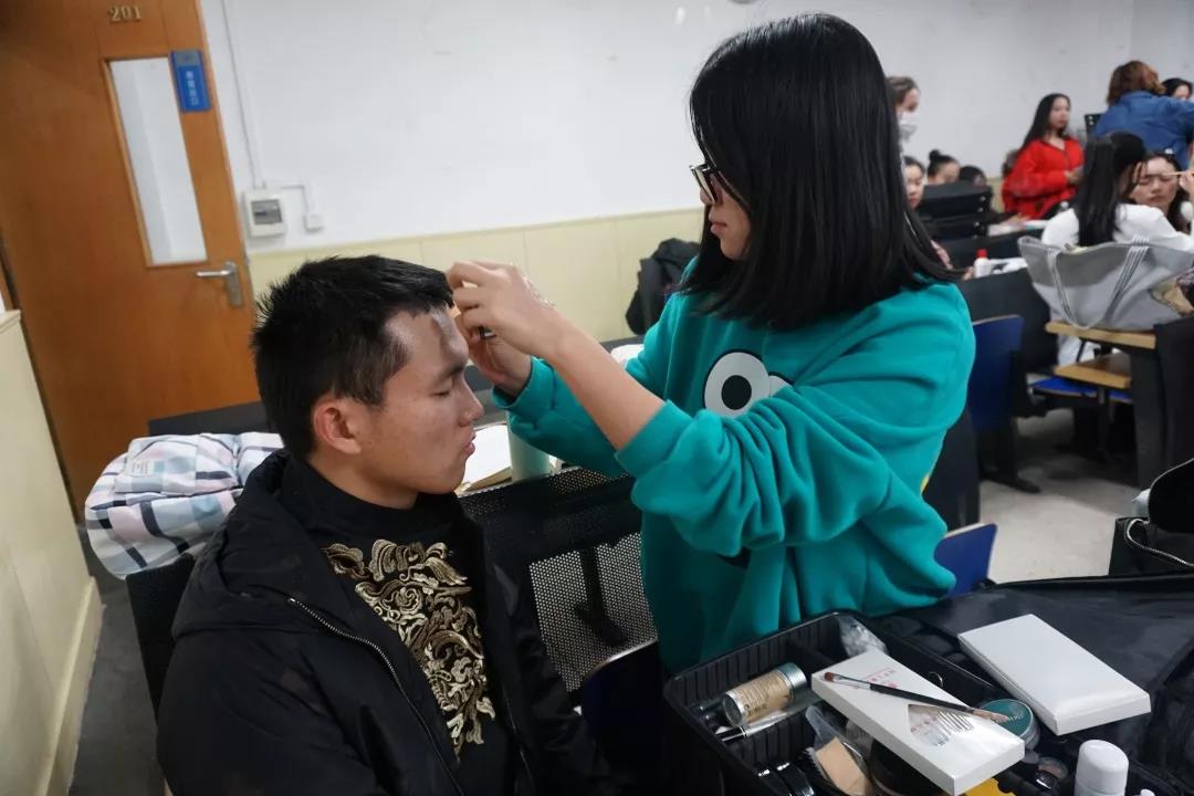 十一点半,男生们在领队的带领下,经过稍微调整,继续练习。女生们则集体前往京师大厦化妆。峨眉纤细,目若清泓,浅浅回眸,令人身心一颤,她们以最美的容颜迎接晚上最美的绽放。四点左右,男生们在艺术楼201集体化妆,翩翩少年,面如冠玉,目若朗星,倜傥风流,俊逸出尘。