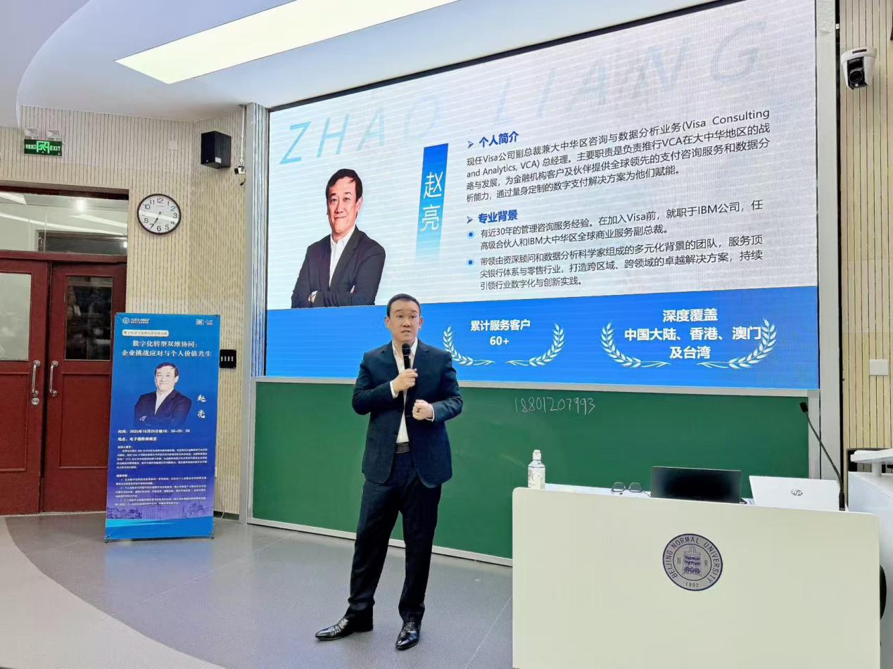 2025年10月25日晚,bat365中文官方网站“数字经济与管理大讲堂”第49讲《数字化转型双维协同:企业挑战应对与个人价值共生》在电子楼阶梯教室举办。本次讲座特邀Visa 公司副总裁兼大中华区咨询与数据分析业务总经理赵亮主讲。经管学院陈夙老师主持讲座,150余位学院本、硕、博学生到场聆听。