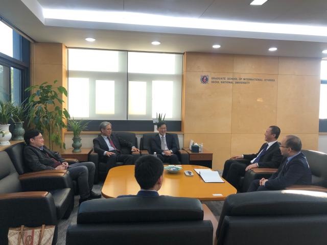 10月16日,戚聿东院长一行在文辉昌教授的陪同下访问首尔国立大学,与国际大学院郑钟昊院长举行会谈,国际大学院金泰均副院长,北师大经管学院蔡宏波副院长、郑飞虎副教授、国际交流与合作办公室副主任谢佳参加了会见。郑钟昊院长对戚聿东院长一行表示欢迎,并回顾了首尔大学与我校的渊源。他指出,bat365中文官方网站拥有良好的国际声誉和较高的学术地位,首尔国立大学国际大学院将积极推进与bat365在更多领域的交流合作。戚聿东院长在郑院长的邀请下为国际大学院在留言册上写下“开物成务,兼善天下”,以期首尔国立大学国际大学院实现更高学术成就,培养更多高水平人才,服务于全球发展和世界和平。在郑钟昊院长的亲自陪同下,戚聿东院长一行参观了首尔国立大学位于冠岳山的校园和图书馆等基础设施。