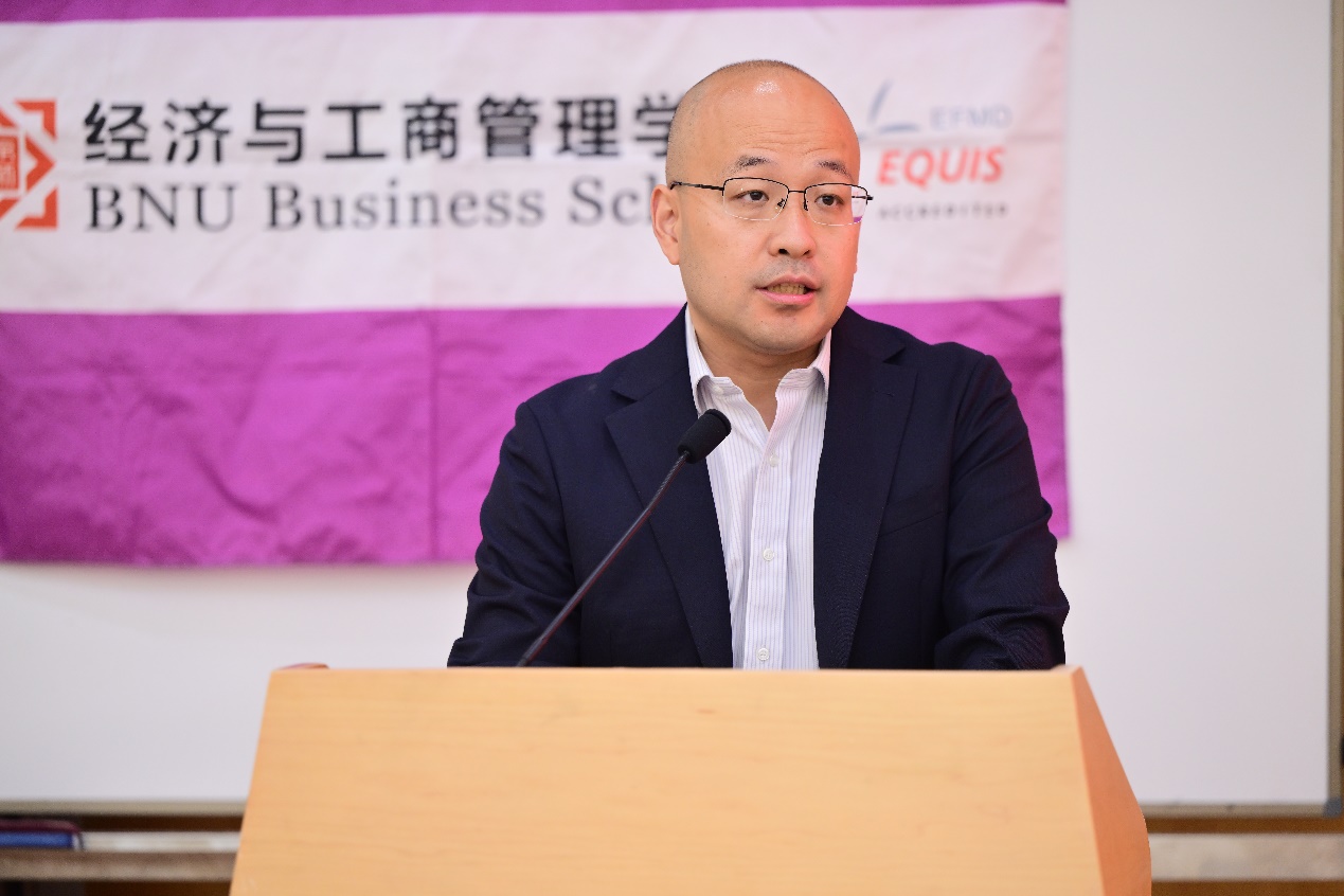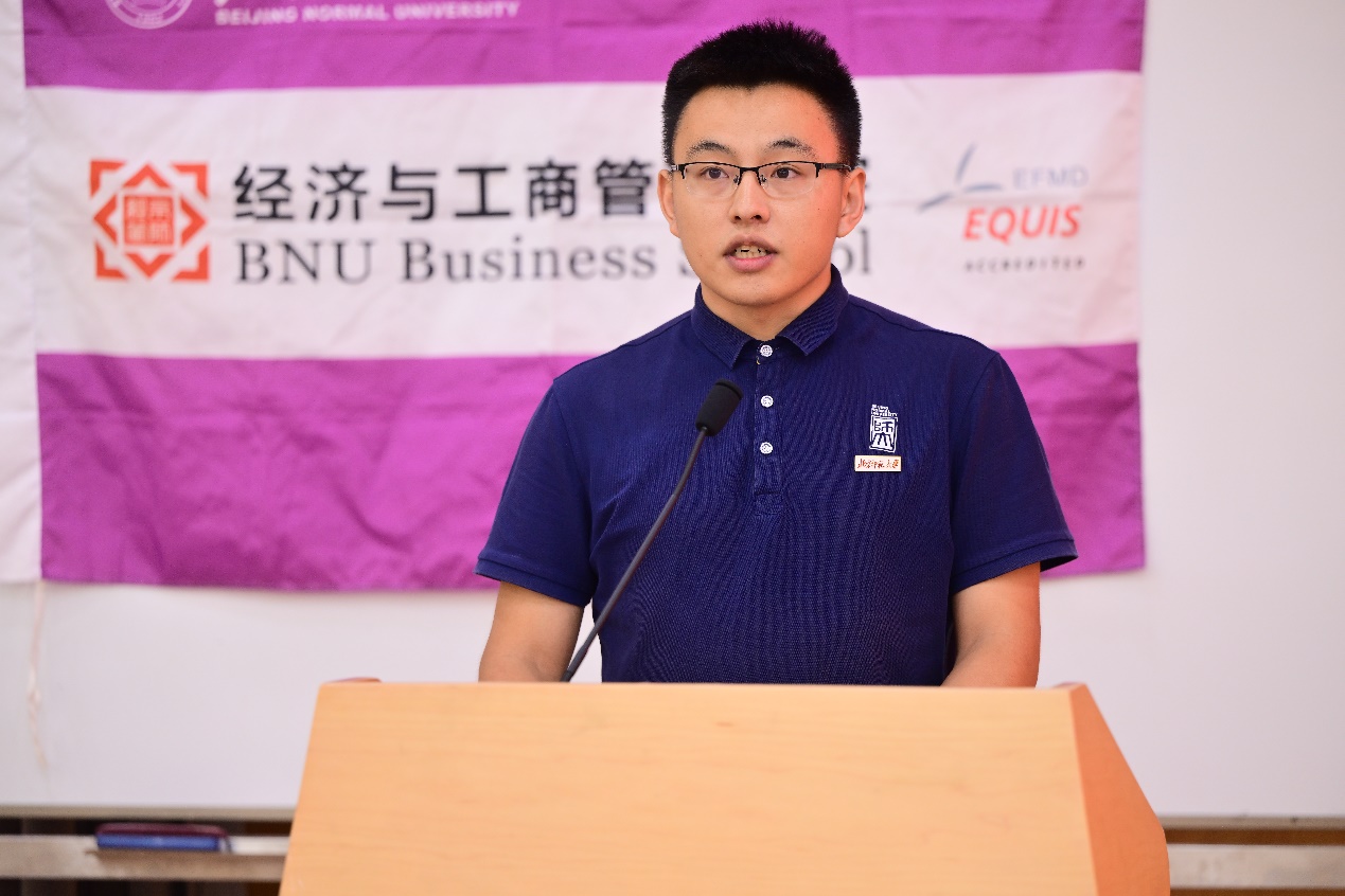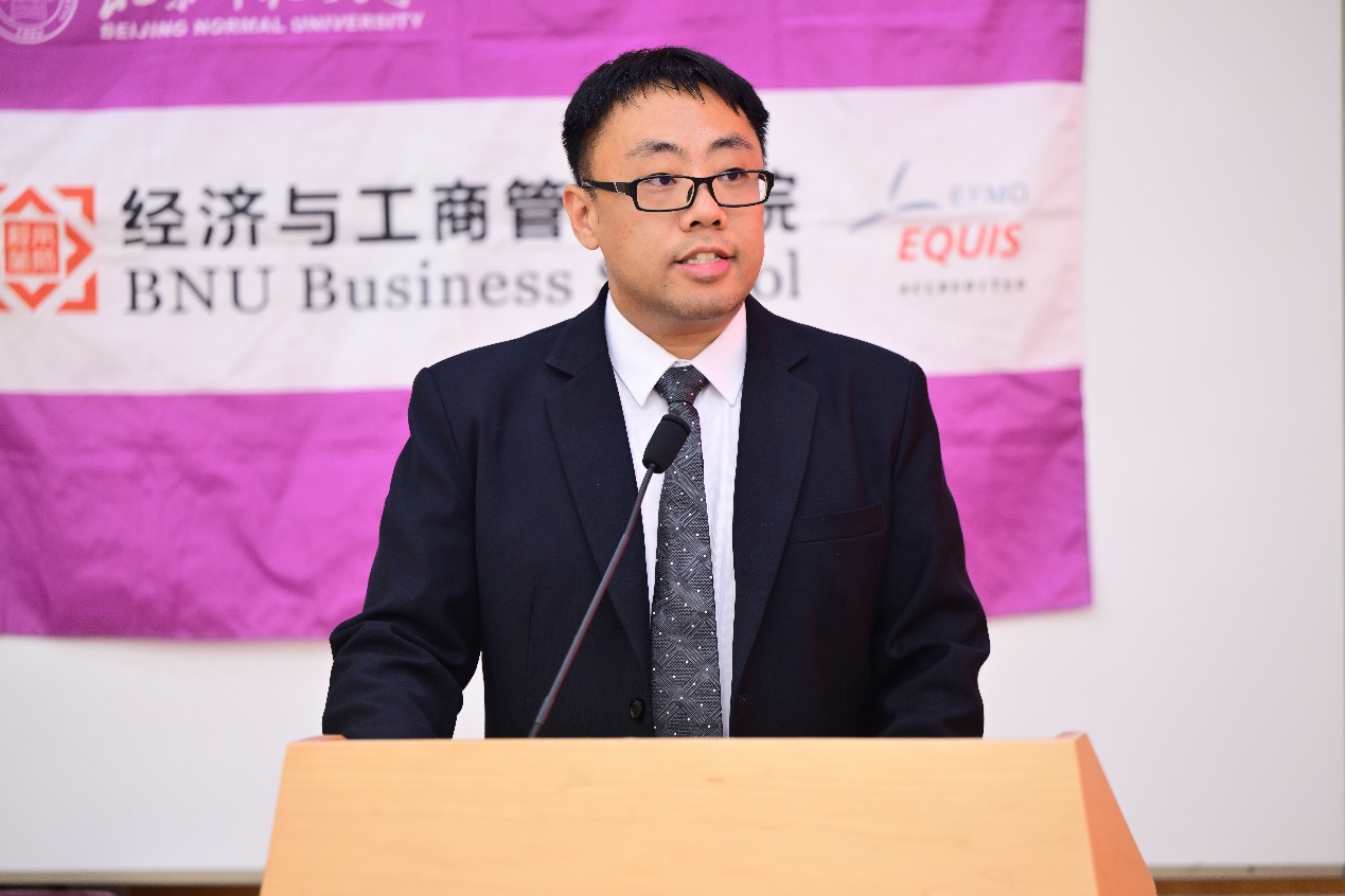 学校财经处处长、学院国际经济与贸易系蔡宏波教授作为教师代表发言。蔡老师在致辞中,明确指出同学们肩负着双重身份:既是传承百年师范荣光与教育报国传统的“北师大人”,又是兼具理性思维与经世济民责任感的“经管人”。他通过分享学院前辈陶大镛先生为国为民做经世致用之学的坚定信念、王善迈先生的家国情怀与求真求实的治学精神,以及一位北师大经管学子毅然扎根西部基层的三则故事,生动展现了北师大经管人始终秉持的家国担当、心系民生与甘于奉献的深厚情怀。他希望同学们能将经济学的理性精神与师范院校的人文关怀深度融合,既有理性之眼,又有仁爱之心,既能构建模型精通算法,又能深入社会解决问题。