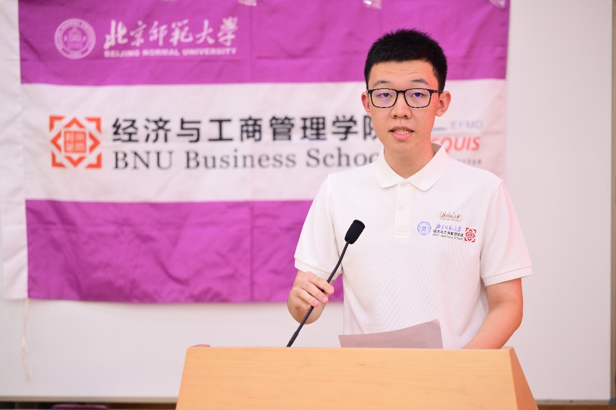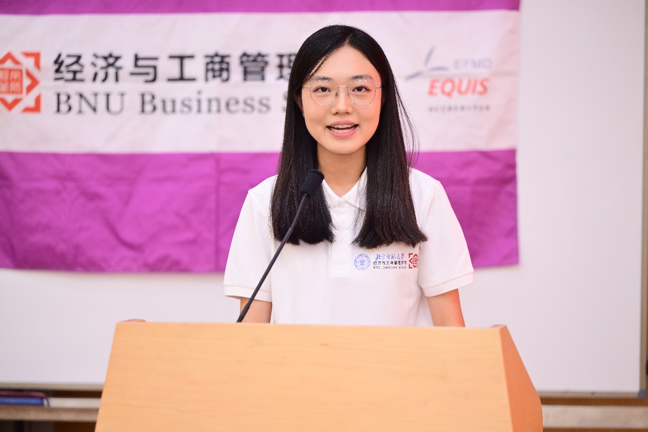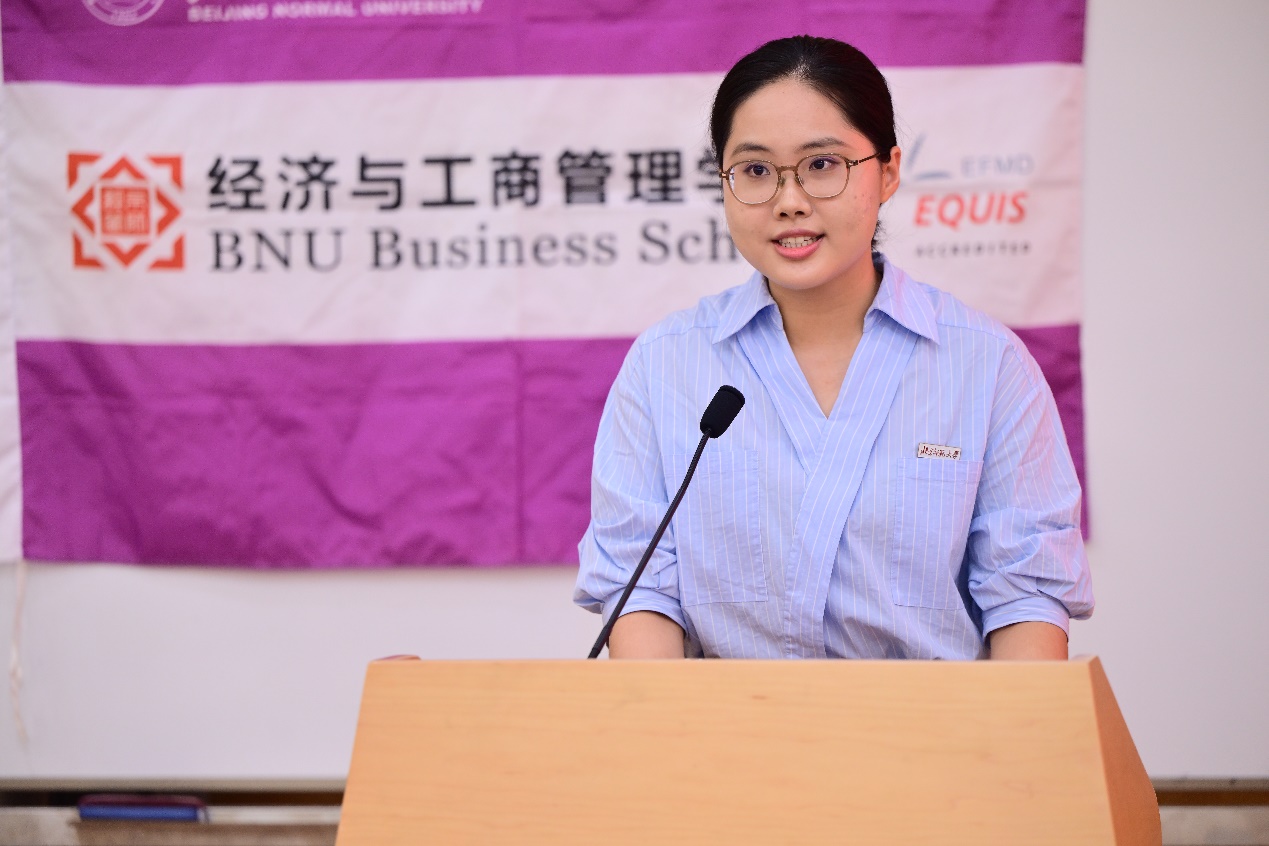 2022级工商管理(数字经济与管理实验班)本科生吴诗雨作为本科生在校生代表发言。她通过对“我们为何而来”问题的探寻,指出北师大经管学院在广度上承载着的无限可能,支持学生的每一种人生选择,在深度上又提供了的坚实支撑,在夯实专业基础、锤炼学术思维的同时,不断认识自我、理解世界。她强调,智力、体力、心力是求学道路上的三股看似朴素却极为重要的力量。她倡导同学们保持好奇与反思,锤炼体魄与耐力,学会内观与自律,勇于探索,不断成长,在追梦的征途上遇见更好的自己。