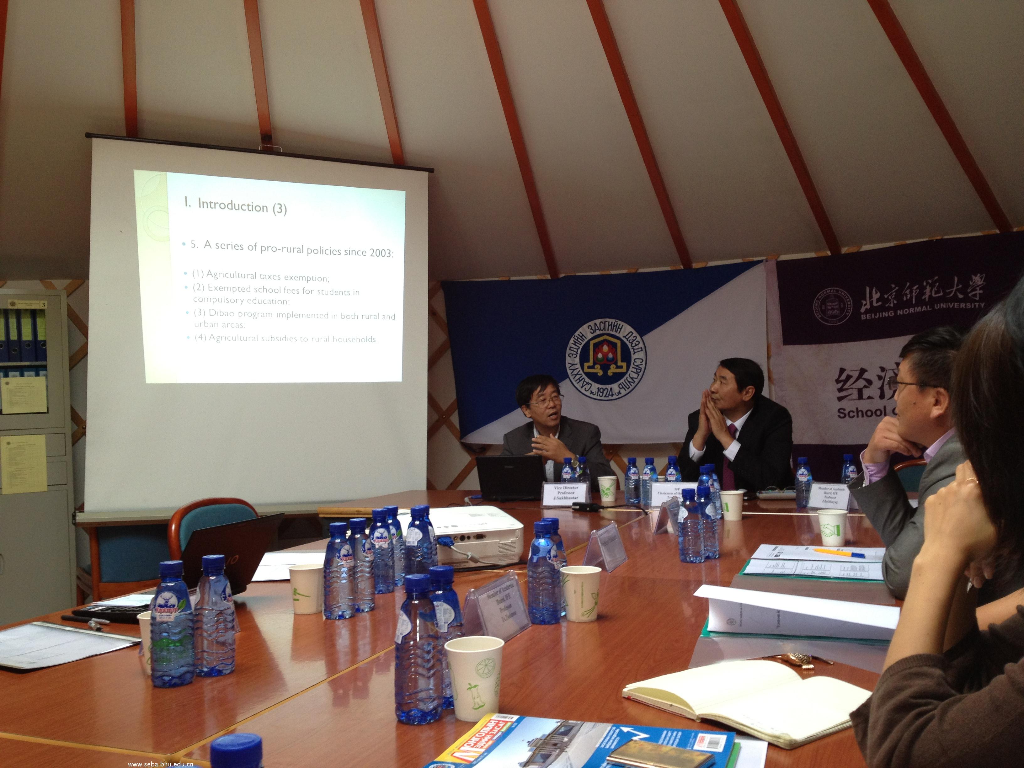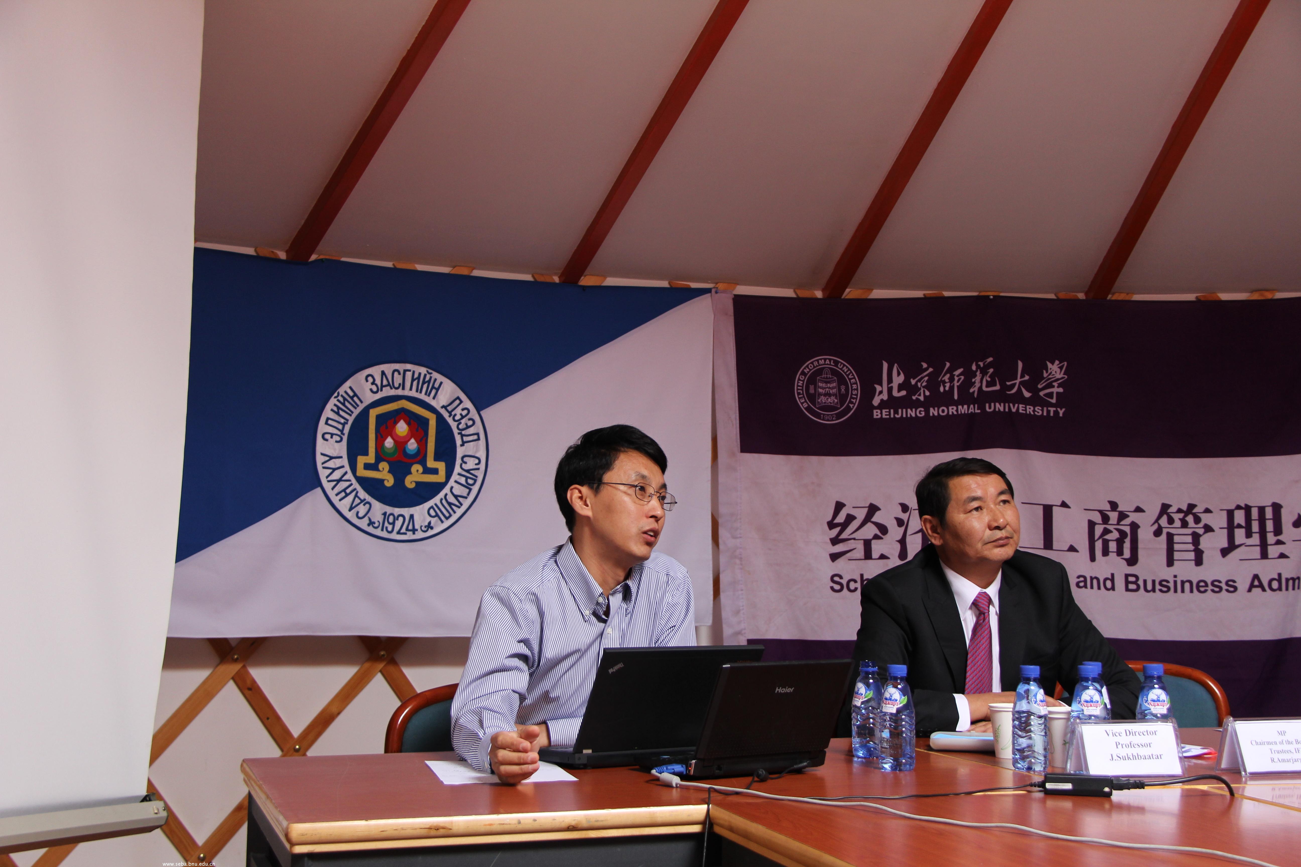2012年7月17日bat365与蒙古财经学院在蒙古乌兰巴托联合举办了Economic development in Mongolia and China研讨会,bat365院长赖德胜、院党委书记沈越、院学术委员会主任李实等教师参加了研讨会。参加研讨会的蒙方代表有蒙古财经大学副校长Sukhbaatar,经济系系主任Batsukh和多位教师、研究生以及蒙古企业和媒体代表。