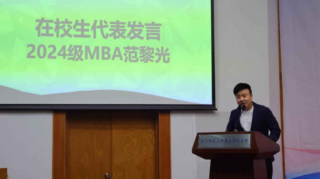 在校生代表、2024级MBA第十七届联会主席范黎光分享自身的学习感悟。他表示,北师大MBA不仅是学术殿堂,更是思想碰撞与实践成长的平台,通过课堂理论学习与课外创业大赛、企业走访等活动,能帮助同学们从“惯性思维”转向“拥抱不确定性”,并以彼得德鲁克“我是谁、我能贡献什么”的命题,鼓励新生成为“主动的变革引领者”。