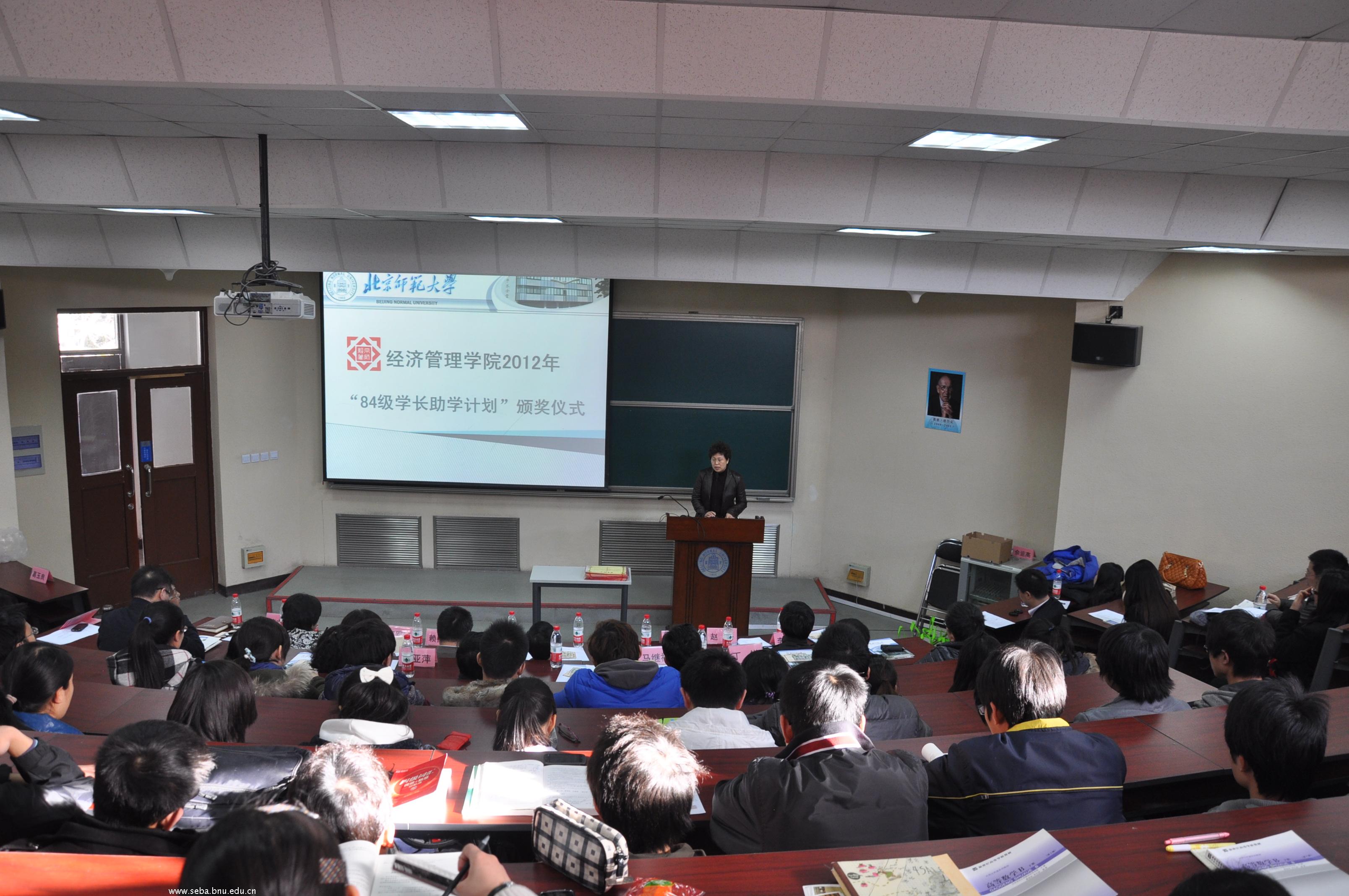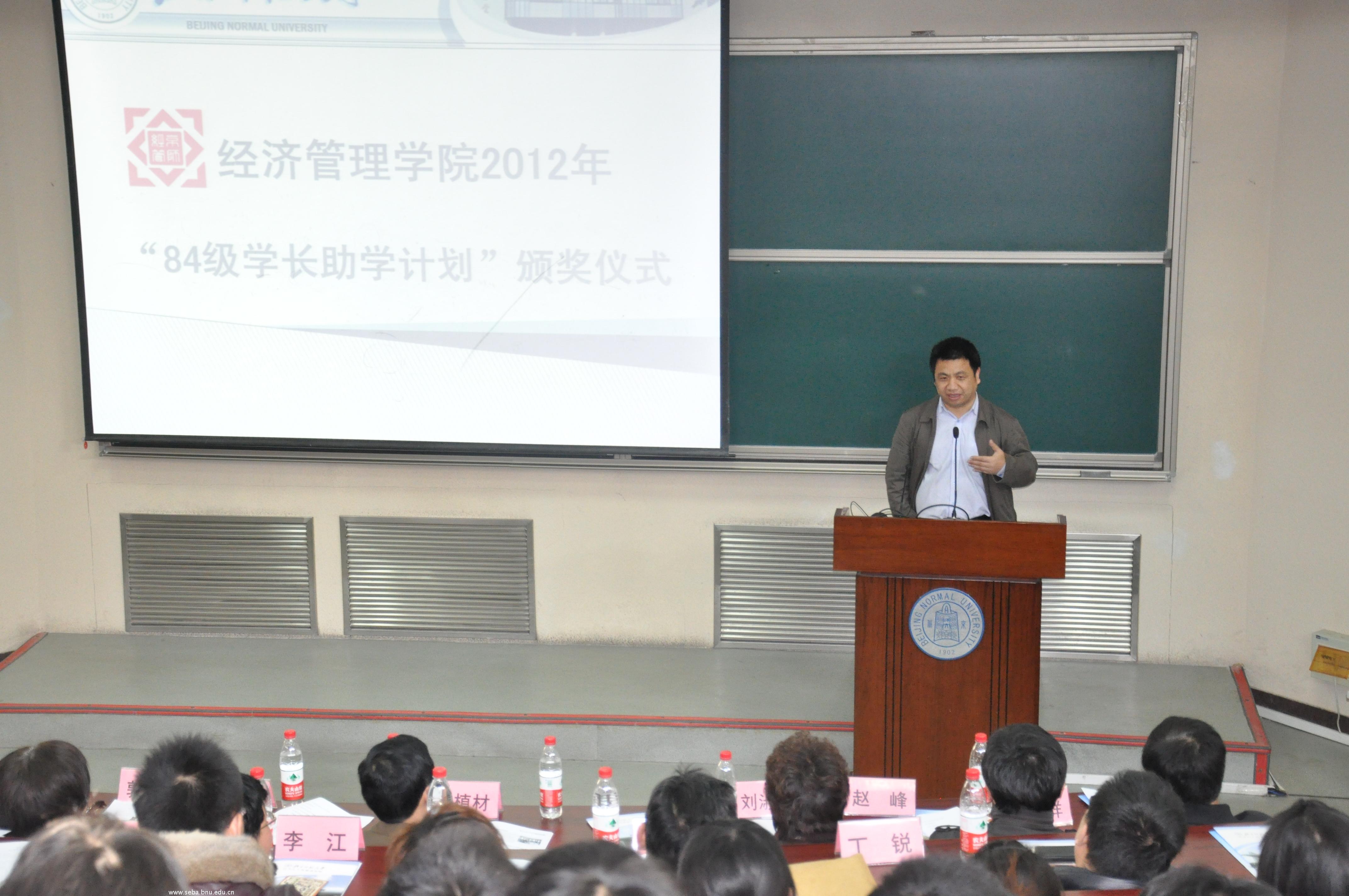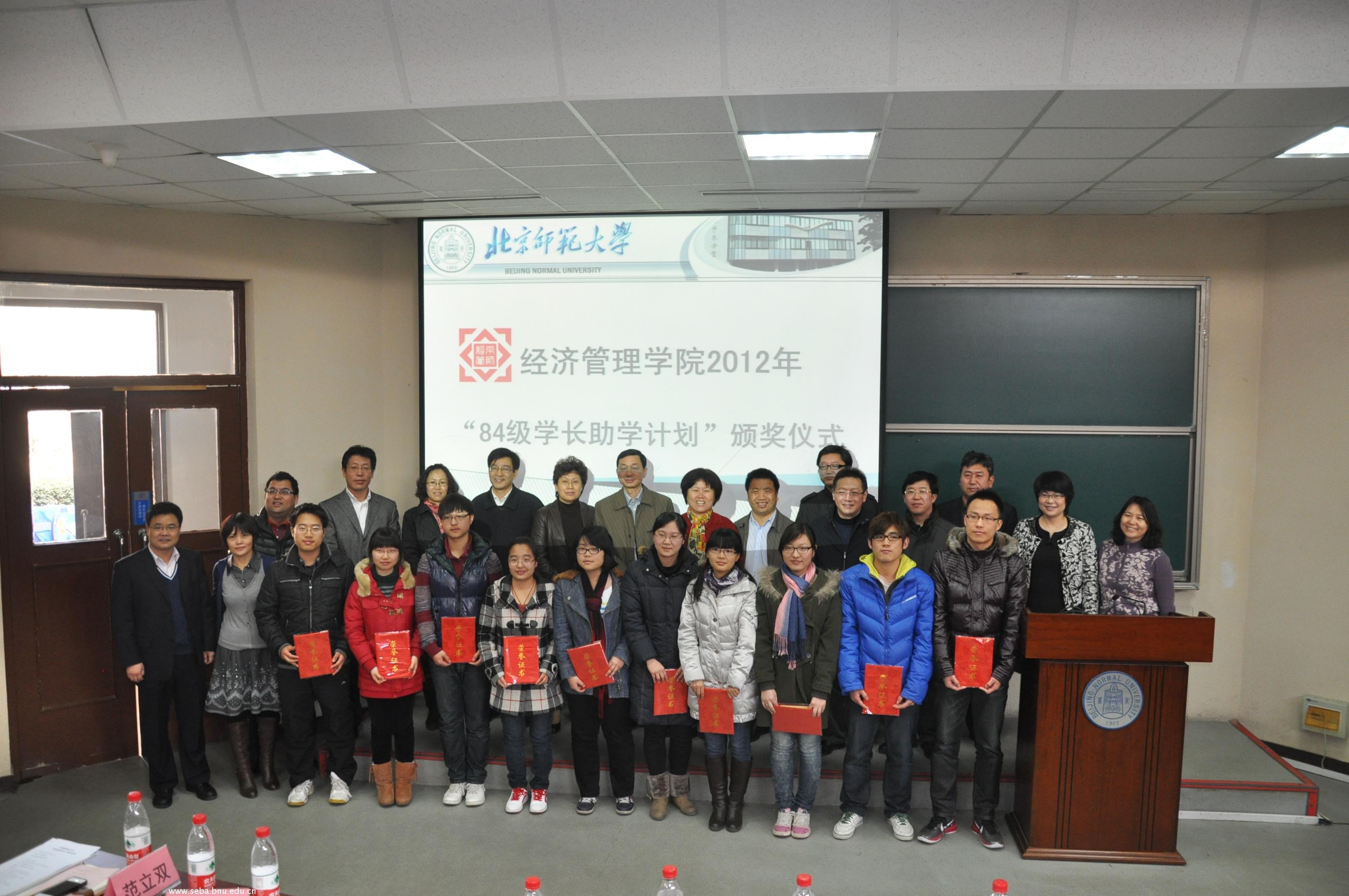 2012年3月10日,经济管理学院2012年“84级学长助学计划”颁奖典礼在电阶梯教室成功举办。典礼由学院分党委副书记葛玉良老师主持,校友会执行秘书长郭军丽老师、发展委员会办公室主任范立双老师、经济管理学院院长赖德胜教授及校友代表华中师范大学经济学院教授赵峰、泰康之家投资有限公司副总裁刘淑琴、中国信息报社长叶植材等13名学长出席了典礼。