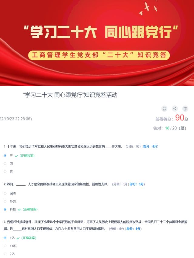 其次,三个支部组织支部成员认真学习党的二十大精神,包括党的二十大报告、习近平总书记在二十届中共中央政治局常委同中外记者见面时的讲话实录等内容。为进一步夯实学习成果,三个支部采用线上线下结合的方式联合开展了“学习二十大,同心跟党行”知识竞答活动,内容涵盖了大会主题、过去五年的工作、新时代十年的伟大变革、新时代新征程中国共产党的使命任务等重要内容。经统计,刘斯琪、张可欣、钟洁等同志取得优异成绩。