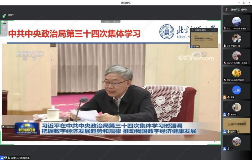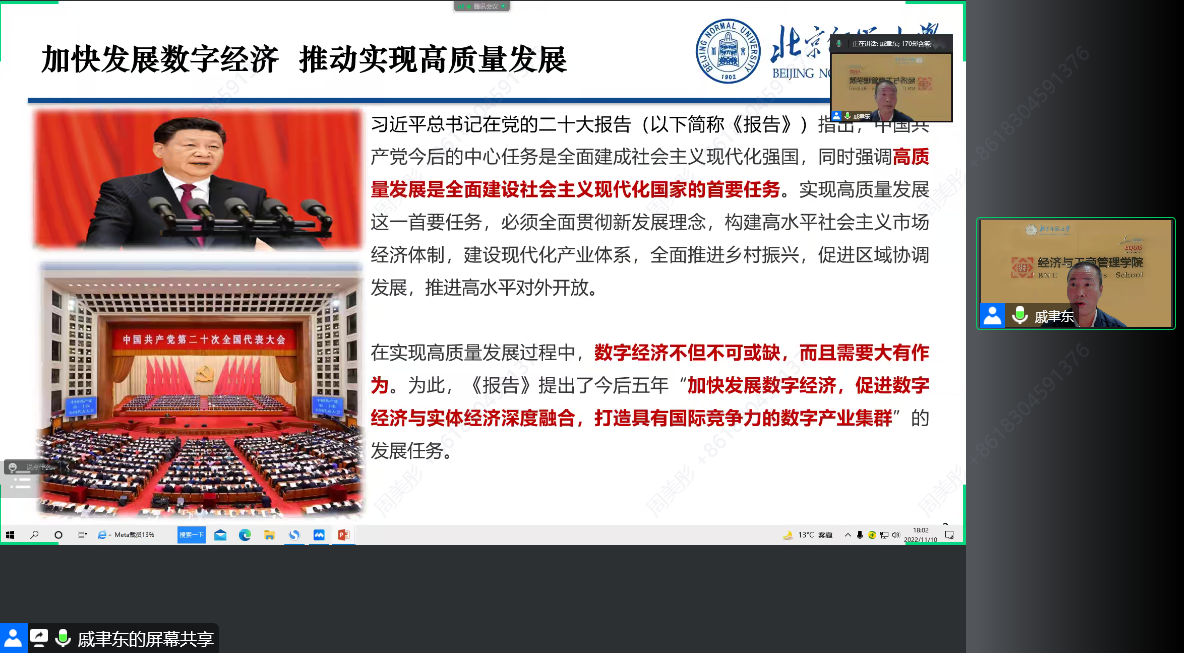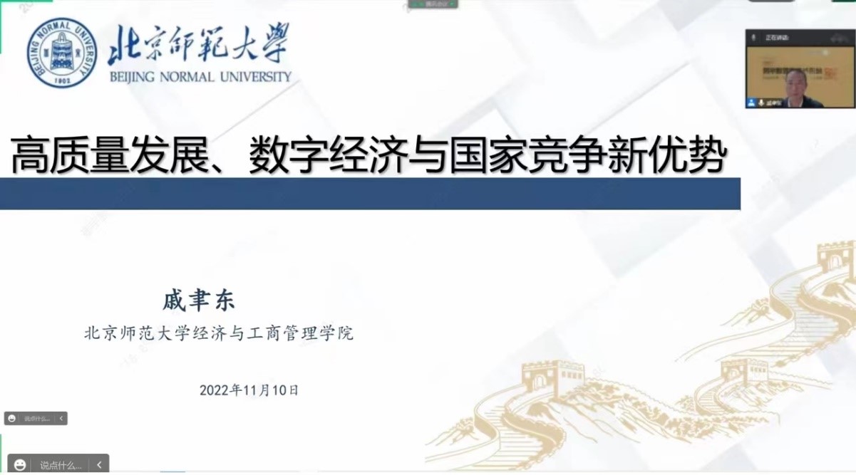 2022年11月10日,bat365中文官方网站二级党校与地理科学学部“大地征途”二级党校联合举办“高质量发展、数字经济与国家竞争新优势”理论讲座。本次讲座是经管学院二级党校第十三期培训的首场讲座,主讲人是bat365中文官方网站院长戚聿东教授。bat365中文官方网站第十三期二级党校学员、两院师生党员和入党积极分子460余人参与了本次讲座。