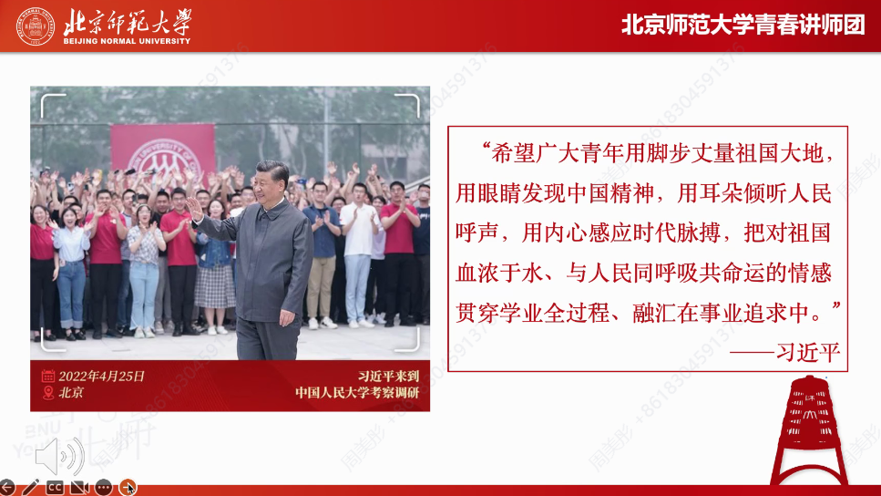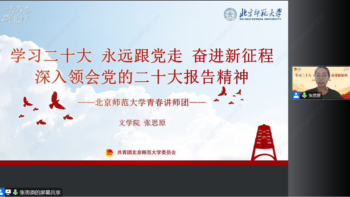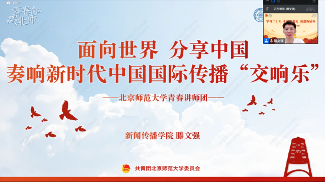 随后,滕文强同学作“面向世界,分享中国,走向新时代中国国际传播交响乐”的主题分享。他带领大家观看了中国共产党国际形象网宣片《CPC》,回顾了中国共产党成立百年以来的奋斗历程和中国人民在中国共产党的带领下所取得的伟大成就。通过列举北师大留学生拍摄冬奥纪录短片、助力讲好中国故事的生动典范,他强调中国青年应讲好新时代的中国故事、传递中国声音,让青春在全面建设社会主义现代化的火热实践中绽放绚丽之花。