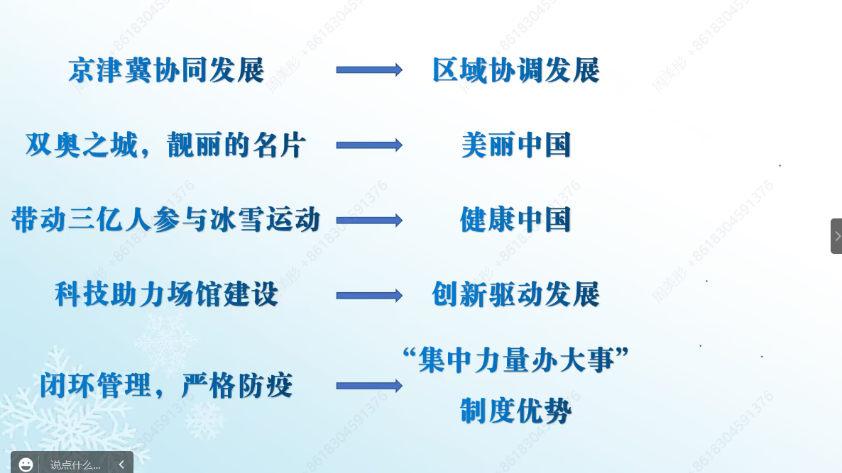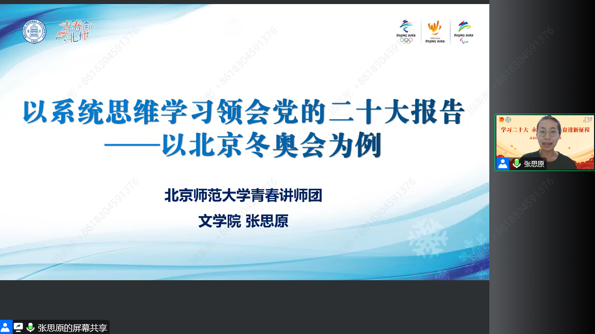 最后,张思原同学作“以系统思维学习领会党的二十大报告——以北京冬奥会为例”的主题分享。她以“京津冀协同发展”“双奥之城,靓丽的名片”“带动三亿人参与冰雪运动”“科技助力场馆建设”“闭环管理、严格防疫”等五个方面为例,依次介绍了党的二十大报告中提到的区域协调发展战略、美丽中国、健康中国、创新驱动发展战略、制度优势等内涵,并生动讲述了自己参加冬奥会志愿服务的难忘经历。
