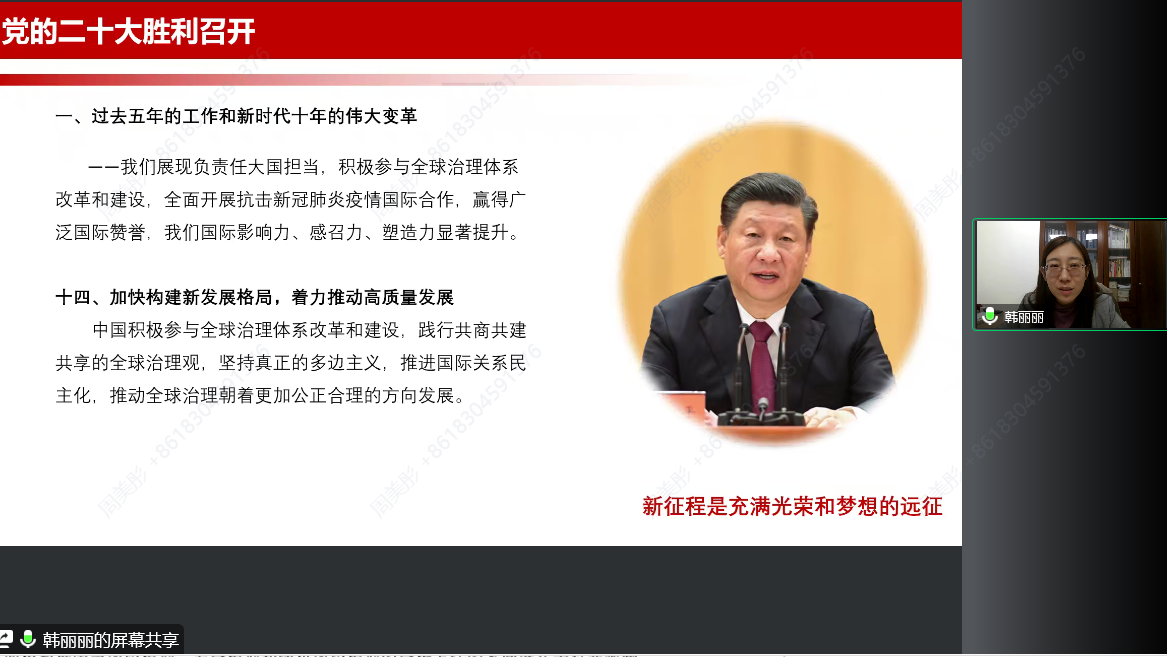 首先,韩老师结合对党的二十大报告的学习,介绍了当前全球治理体系面临的挑战与抉择,指出了在过去五年工作和新时代十年的伟大变革中,中国展现负责任大国担当,积极参与全球治理体系的改革和建设,全面开展抗击新冠肺炎疫情国际合作,提升国际影响力、感召力、塑造力的现实成就。
