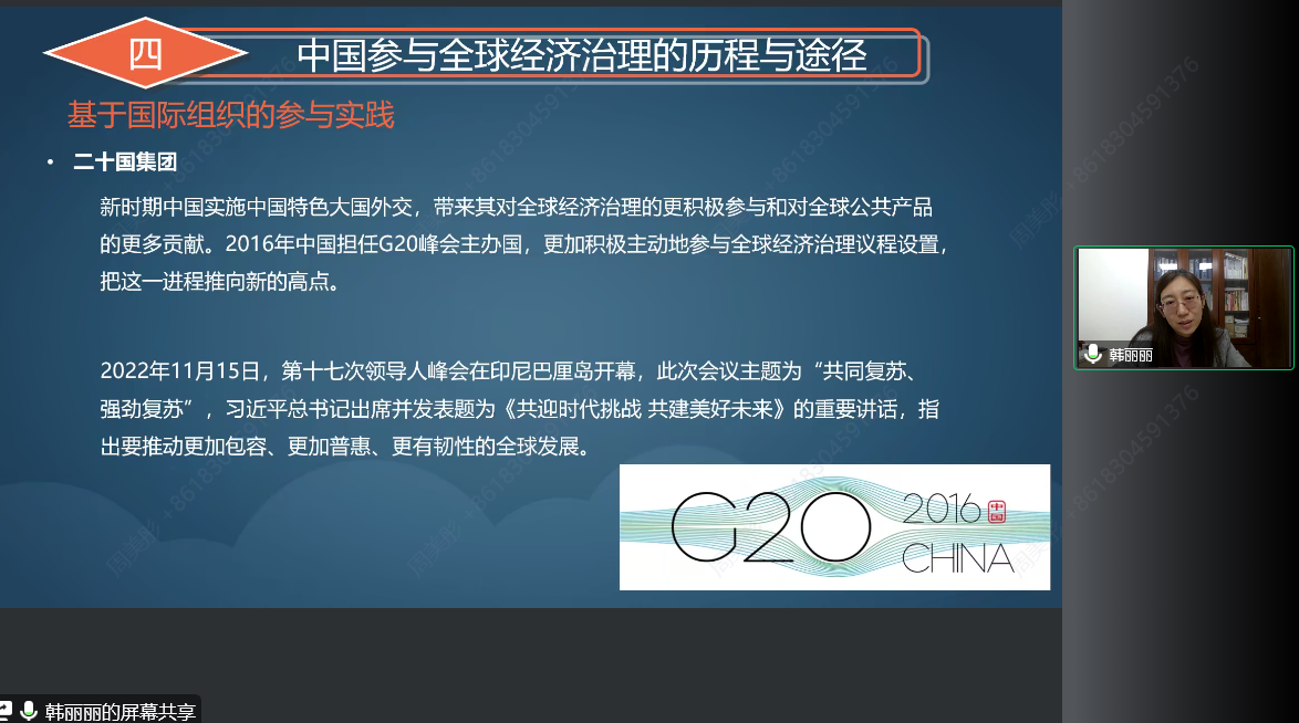 随后,韩老师分别基于主权国家和国际组织的视角,梳理了全球经济治理体系由发达国家主导向发展中国家广泛参与的演变进程,阐述了全球经济治理的内涵与沿革,分析了导致全球经济治理陷入新困境的原因。韩老师基于人类命运共同体的视角深入剖析了中国参与全球经济治理的理论基础,讲述了中国参与全球经济治理的历程与路径。她指出,结合着改革开放的进程,中国从学习与适应到探索与融入、再到如今的建设与引领,在新时代实施中国特色大国外交,对全球经济治理和全球公共产品供给做出更大贡献。