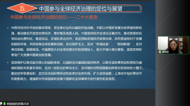 最后,韩老师结合党的二十大报告提出中国参与全球经济治理的定位与展望,阐述了积极参与多边治理体系、推动全球贸易治理建设、参与全球科技治理体系、拓展文化理念传播渠道、深度参与全球贫困治理、树立综合治理理念等中国未来参与全球经济治理的实施路径建议。她强调,我国要坚定不移地参与全球经济治理,继续坚持推进经济全球化稳定发展,不断以中国新发展为世界提供新机遇,推动建设开放型世界经济。