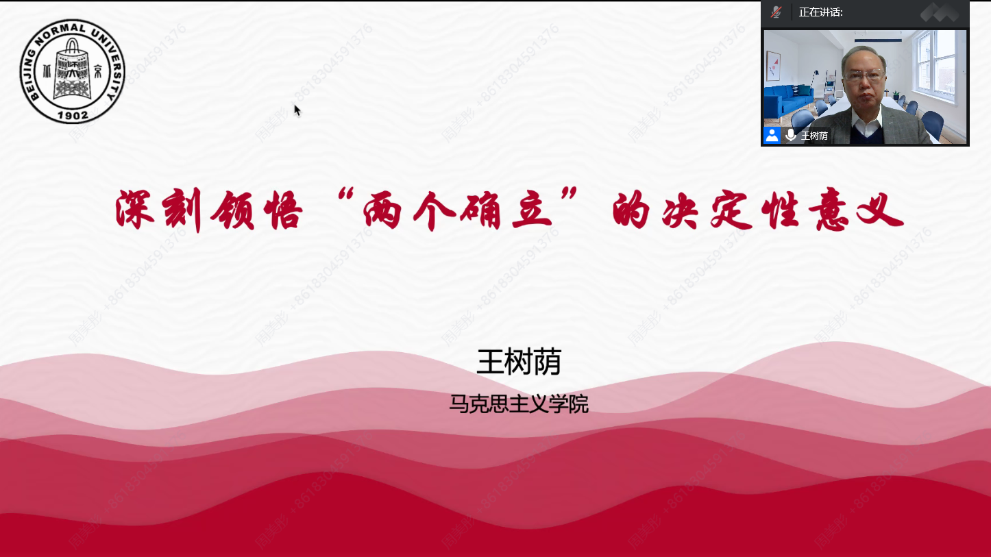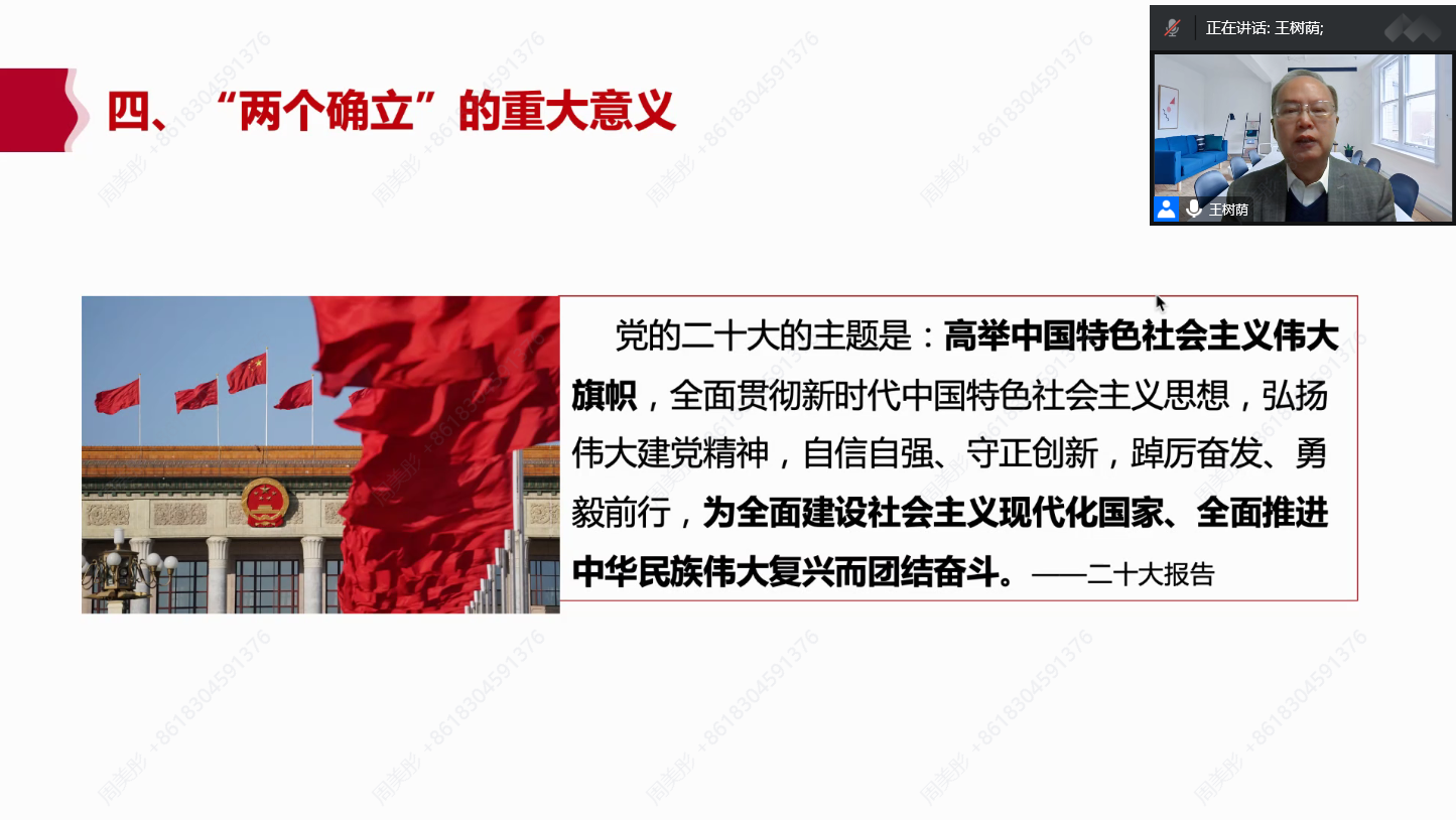 首先,王老师从“两个确立”的科学含义、“两个确立”是一个有机整体、“两个确立”的经典论述等三个方面,系统解读了“两个确立”的理论意蕴。党的十八届六中全会正式确立习近平总书记党中央的核心、全党的核心地位,党的十九大确立了习近平新时代中国特色社会主义思想在全党的指导地位。王老师强调,理论上清醒政治上才能坚定,政治上坚定才能自觉遵守与践行理论,“两个确立”相辅相成、密不可分。