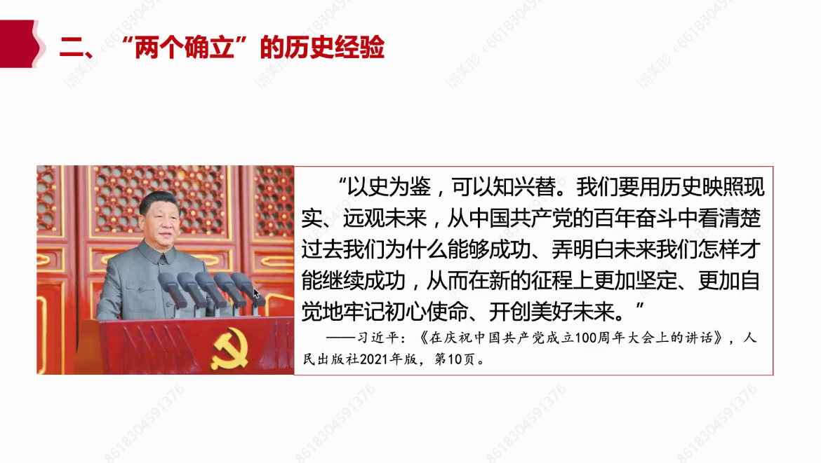 随后,王老师结合丰富的史料,向大家介绍了“两个确立”的历史经验。中国共产党人的经验总结充分证明了确立核心的重要意义。王老师强调,“两个确立”是革命、建设、改革事业伟大胜利的根本保证,是创造新民主主义革命的伟大成就、社会主义革命和建设的伟大成就、改革开放合社会主义现代化建设的伟大成就、新时代中国特色社会主义的伟大成就的基础。