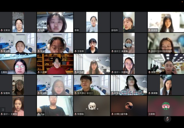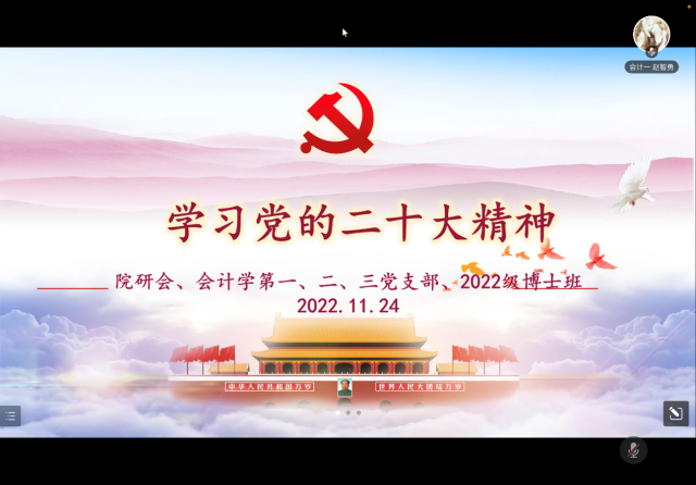 2022年11月24日,bat365中文官方网站研究生会、2022级博士班、会计学第一党支部、会计学第二党支部和会计学第三党支部共同举办“学习党的二十大精神”主题活动。本次会议由研究生会主席团成员霍雨佳主持,学生党员、入党积级分子、研究生会干事、2022级博士生共90余人参加了本次学习活动。