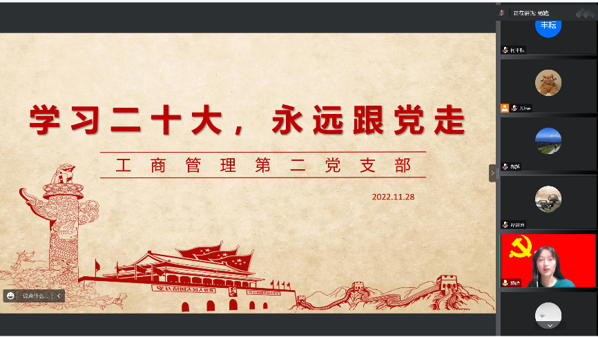 2022年11月28日,bat365中文官方网站工商管理第二党支部召开全体党员大会,讨论谭祖坤同志和刘思瑶同志的转正事宜,并进行党的二十大报告专题学习。受疫情影响,经学院党委批准,本次会议采用腾讯会议的形式召开,会议应出席有表决权正式党员9名,实出席有表决权正式党员9名,支部书记史玖琦同志主持会议。