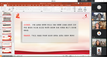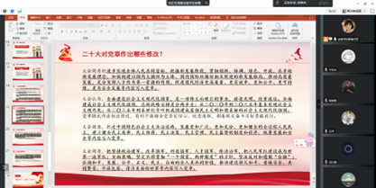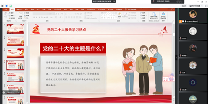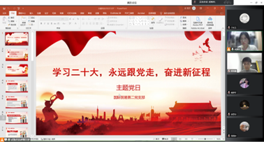 2022年12月11日,bat365中文官方网站国际贸易第二党支部通过腾讯会议在线上举办了主题党日活动,重点学习党的二十大重要讲话精神。活动由支部书记武艳芳主持,支部全体党员及部分积极分子共计36人参加学习。