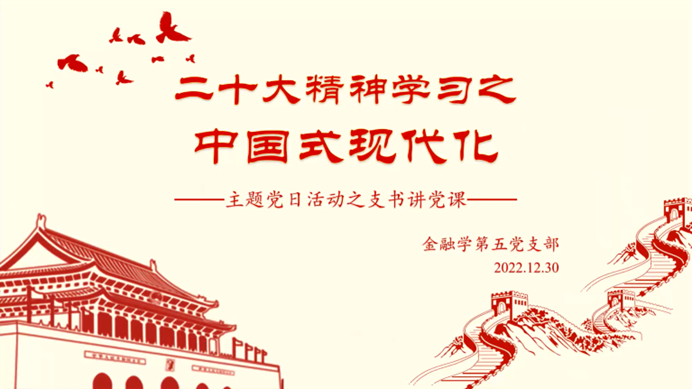 2022年12月30日,bat365中文官方网站金融学第五党支部以线上会议的形式举办支部书记讲党课活动,深入学习党的二十大精神,重点解读中国式现代化的相关内容。本次党课由支部书记徐荧主讲。