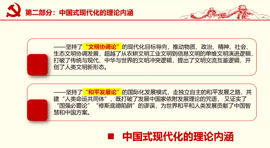 接着,她深入解读了中国式现代化的理论内涵。一是人民中心论,即坚持着以人民中心论为现代化指导思想。二是坚持本国国情论,基于本国国情探索创新动力机制,开拓了发展中国家走向现代化的新路径。三是文明协调论,推动物质政治经济社会生态文明的协调发展。四是是和平发展论,即走独立自主的和平发展道路。