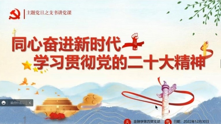 2022年12月30日,bat365中文官方网站金融学第四党支部举办支部书记讲党课活动,主题为“同心奋进新时代,学习贯彻党的二十大精神”。本次党课由支部书记赵新宇主持,共有20名党员和入党积极分子同志参与本次活动。