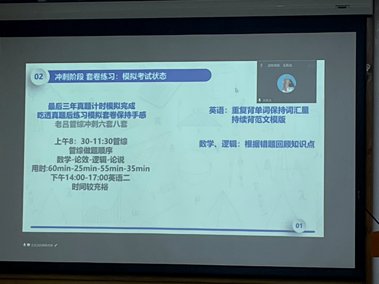 王奕洁详细介绍了冲刺阶段复习的规划,心态调整的重要性,以及考前的准备工作。对于复习规划,王奕洁建议在冲刺阶段通过套卷练习模拟考试状态,尤其是在上午和下午的固定时间段内专注于不同的科目。她分享了她的管综做题顺序和时间分配,以及如何通过练习最后三年的真题和模拟套卷来熟悉题型和保持状态。此外,她还强调了英语复习中背单词和范文模板的重要性,以及数学和逻辑部分应根据错题回顾知识点。在心态调整方面,王奕洁提到不应被客观情况所影响,要相信自己的准备,并保持复习的惯性直到最后一刻。她还建议调整好作息和饮食,以保持最佳状态。考前准备则涉及到是否需要预定考点附近的酒店,熟悉考场环境,以及确保考试当天带齐准考证、身份证和文具。她还提供了一系列关键时间点,如准考证的下载日期,考试日期,以及成绩公布和复试的时间线。最后,王奕洁建议考生们初试后尽快估分,利用寒假时间复习复试内容,提前准备毕业论文等其他事务。她以鼓励的话语结束了分享,预祝大家都能取得理想的成绩。