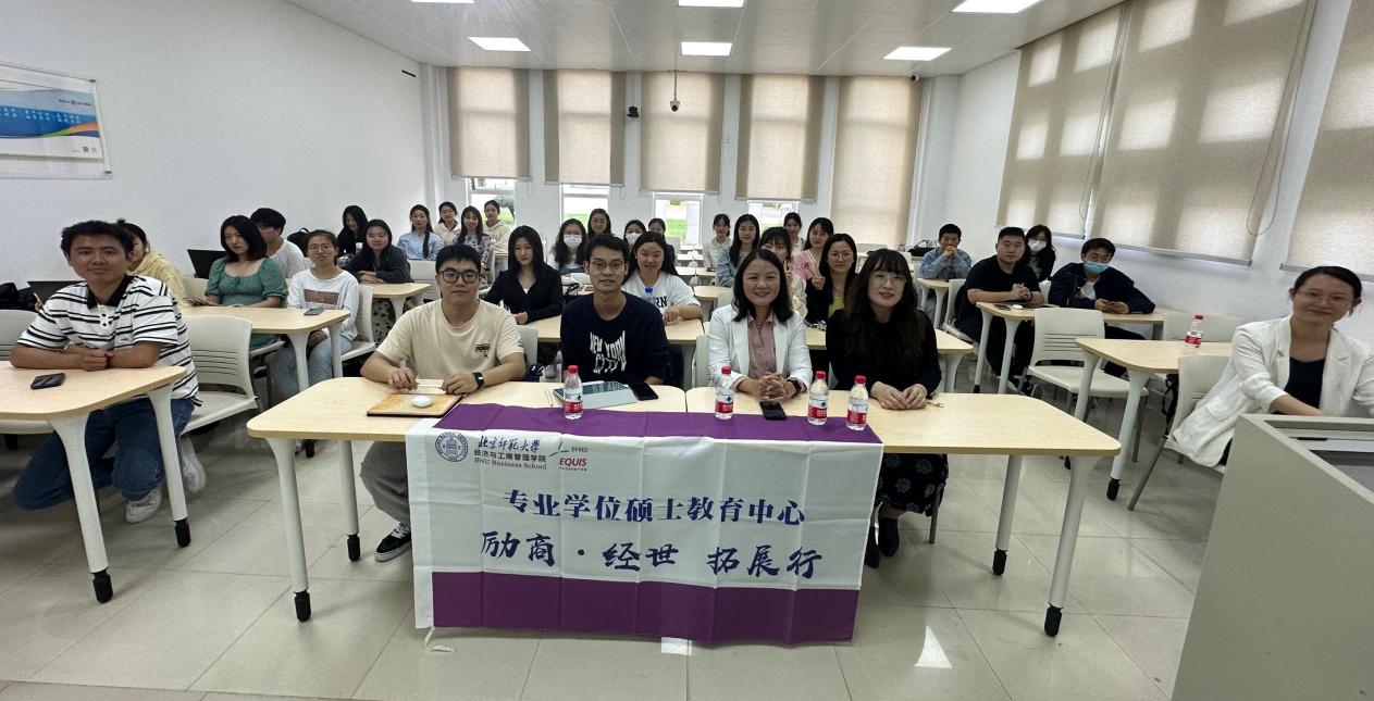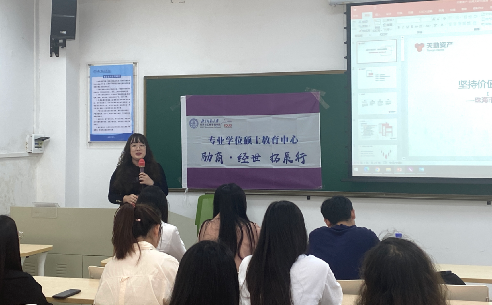3月17日bat365中文官方网站专业学位硕士教育中心举办励商·经世·拓展行系列活动,邀请校外导师中信证券华南股份有限公司珠海文园路证券营业部总经理张胜蓝老师,及珠海市横琴天勤资产管理有限公司副总经理(投资总监)刘竹女士,为2022级专业学位硕士研究生进行就业指导。