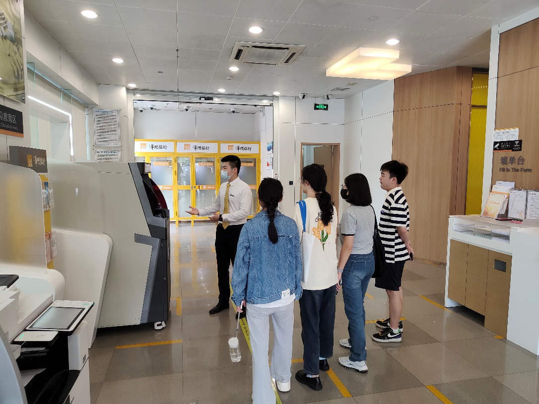 新香洲一级支行副行长李殷弘、九悦支行邱娟梅行长对师生的到来表示欢迎,银行工作人员热情地带领同学们参观支行大厅,讲解各岗位工作性质和内容,通过参观支行内的智能设备,让同学们感受到华润银行在数字化、智能化方面的转型实践。